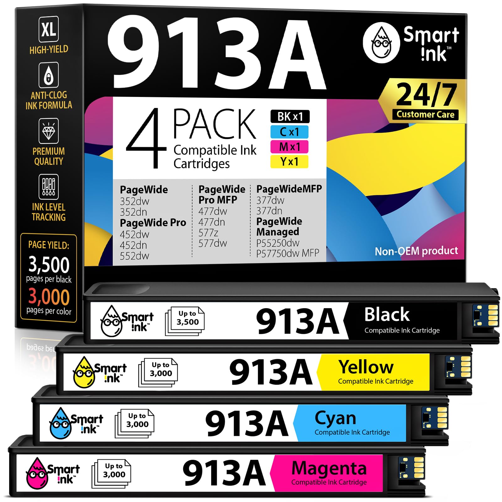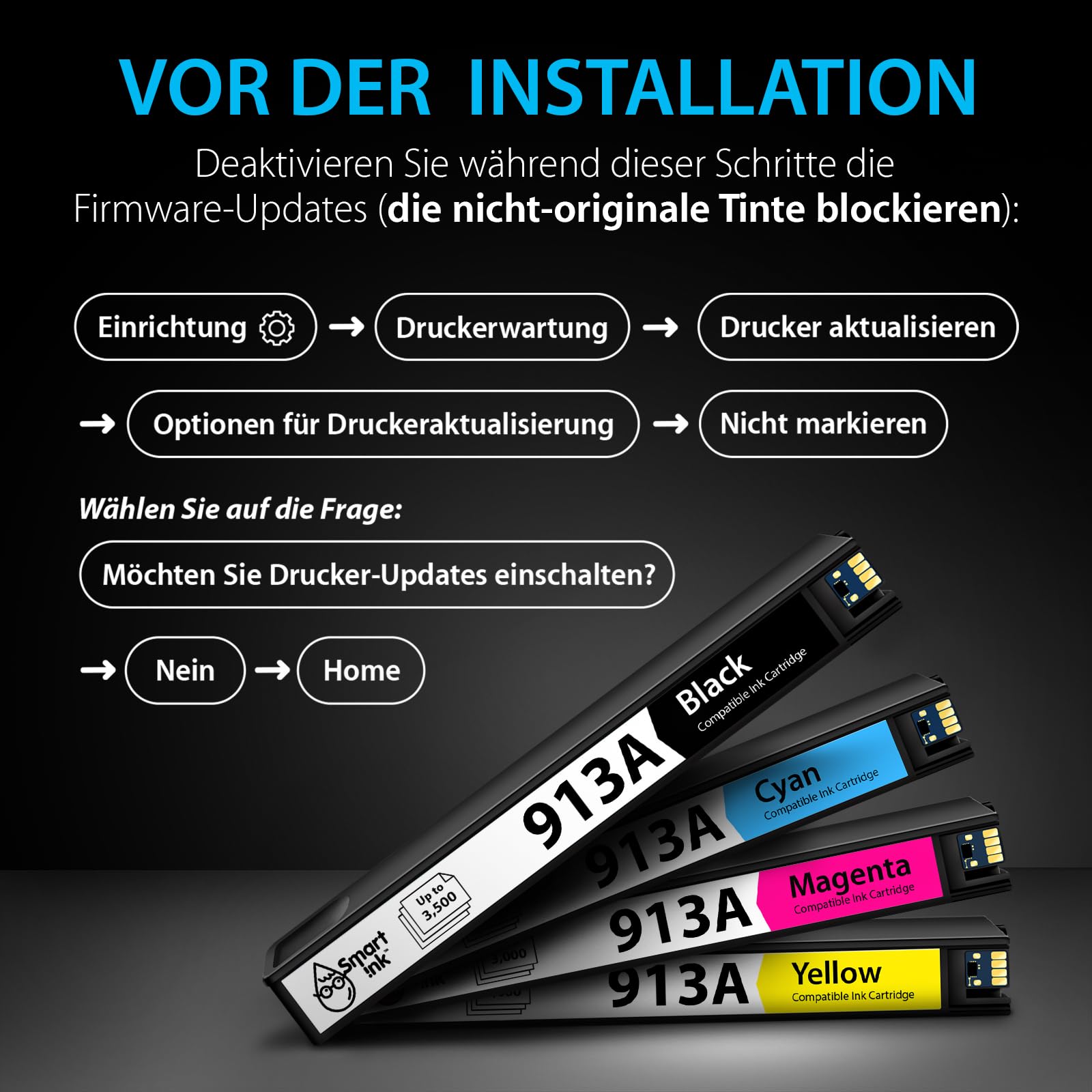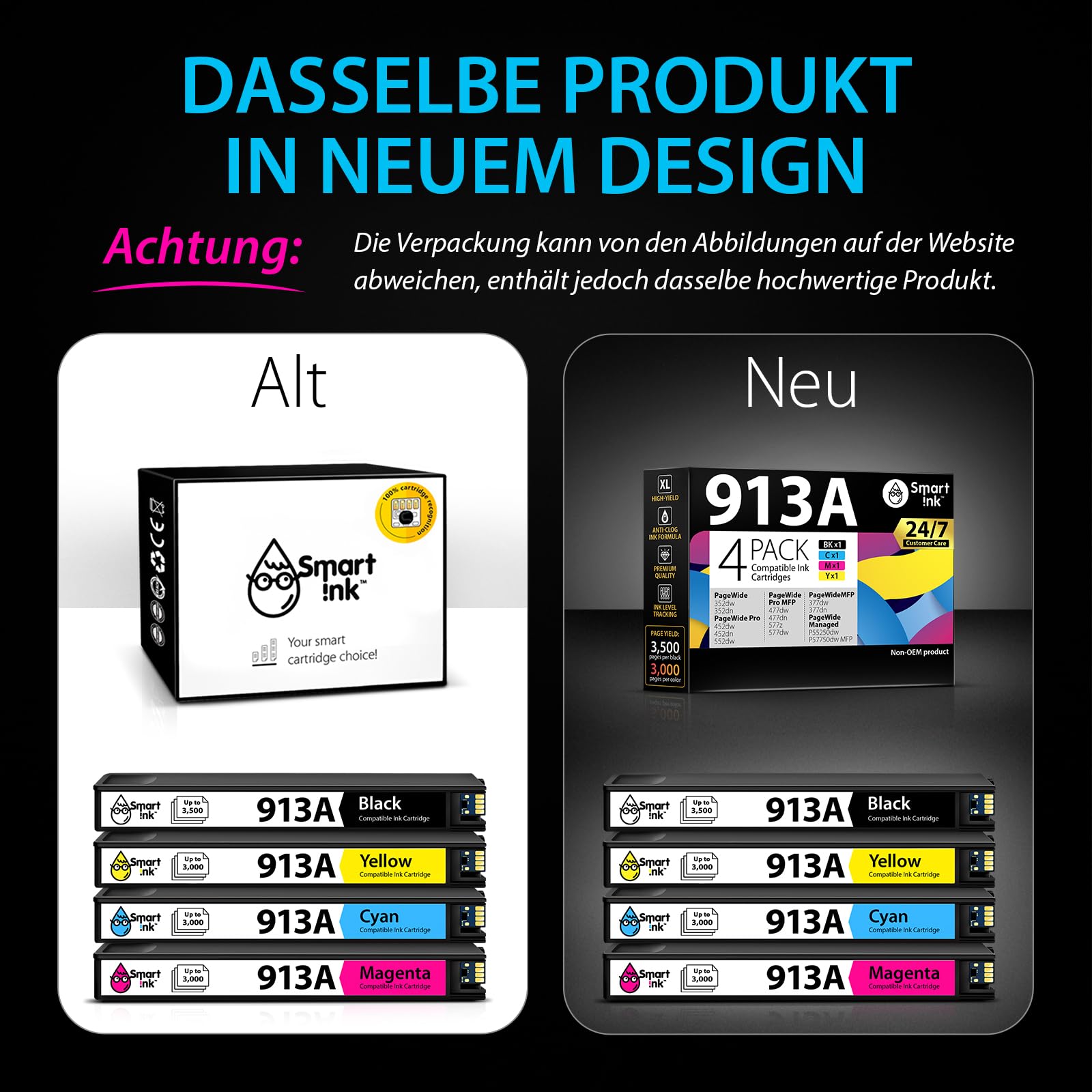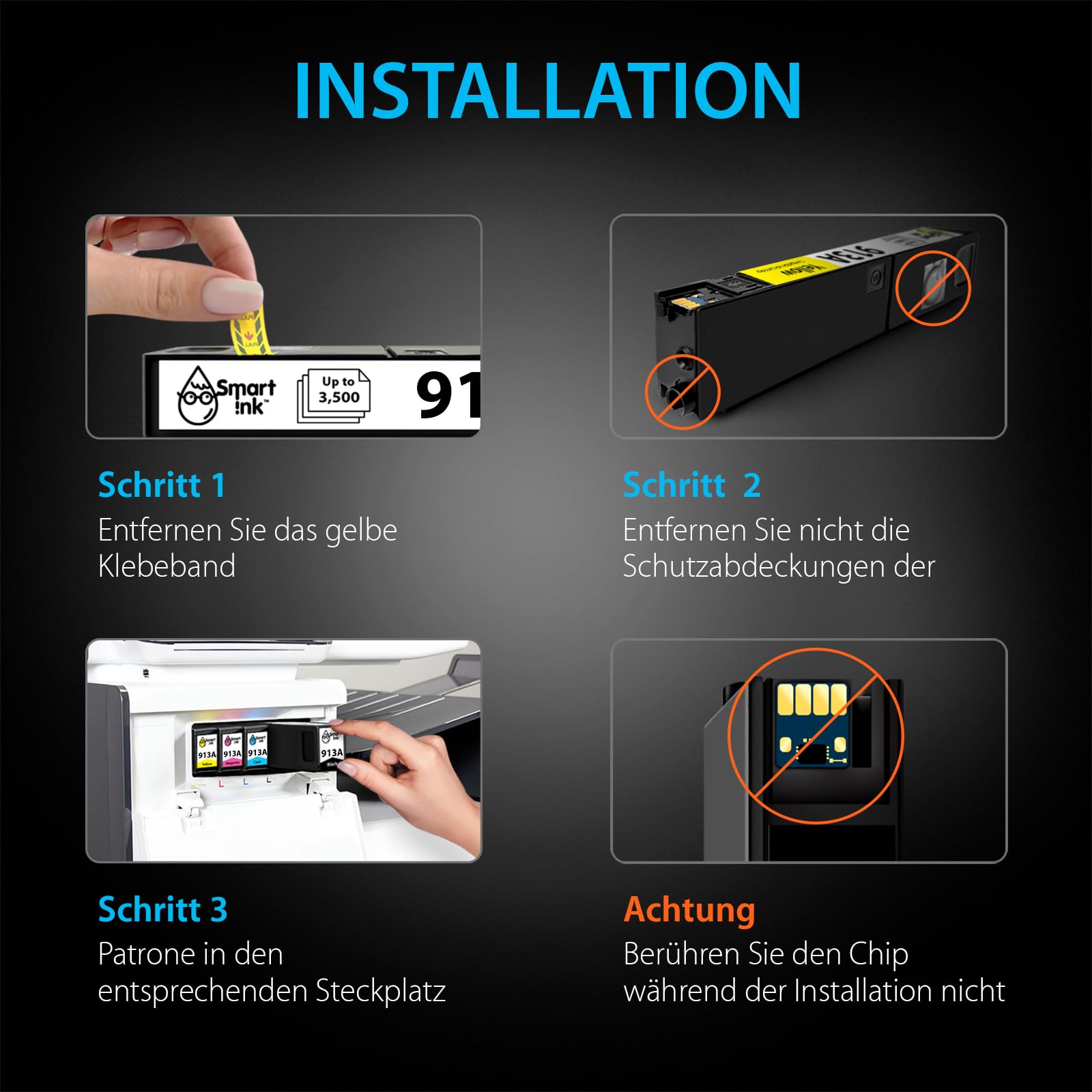 - Lieferumfang: Ein komplettes Set mit vier Patronen – 1x Schwarz (913A), 1x Cyan (Blau, 913A), 1x Magenta (Rot, 913A) und 1x Gelb (913A).