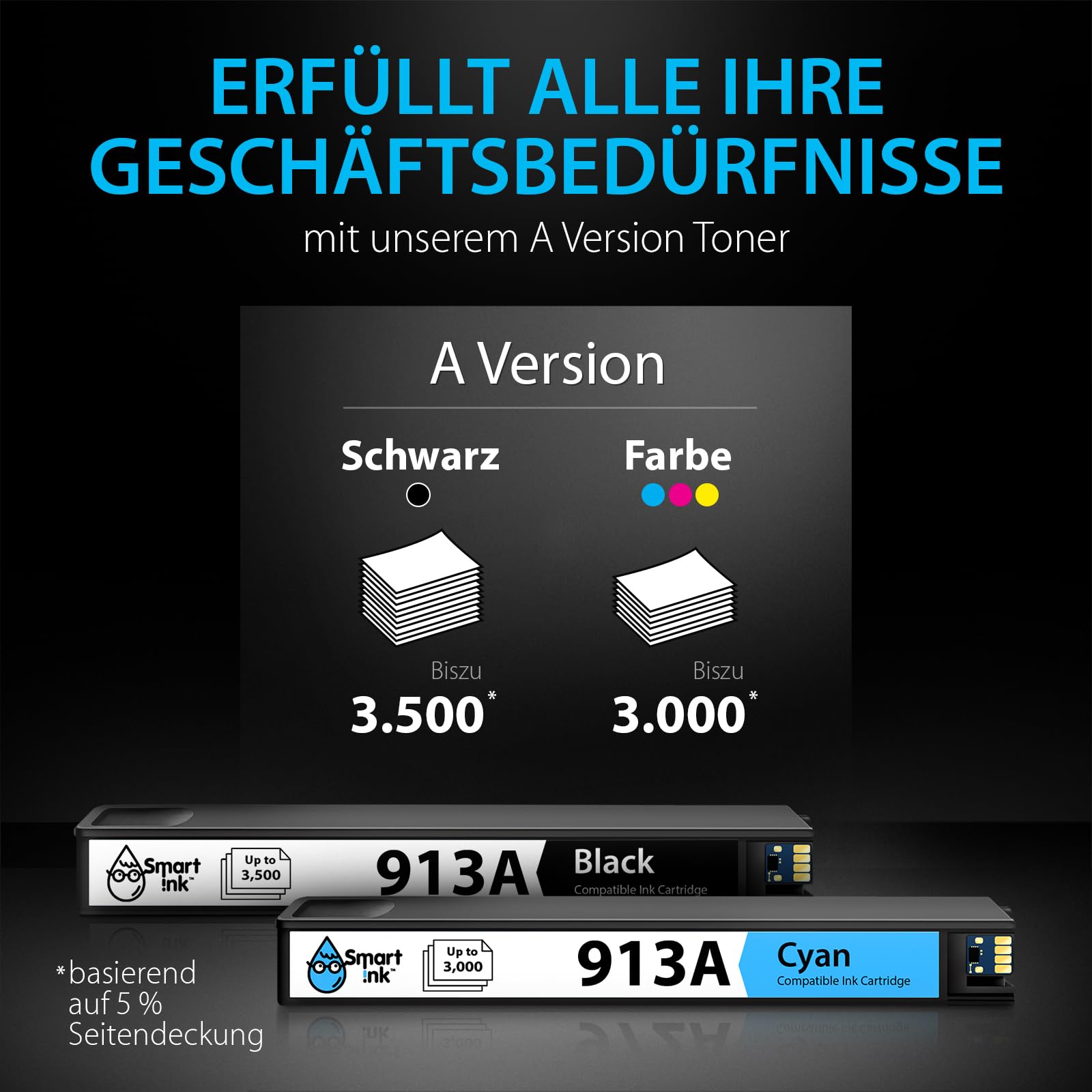 - Hohe Druckleistung: Erreichen Sie eine Reichweite von bis zu 3'500 Seiten in Schwarz und bis zu 3'000 Seiten pro Farbpatrone bei einer Standarddeckung von 5%.