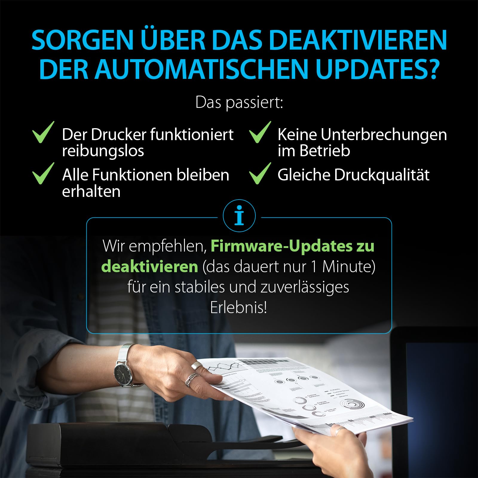 Druckerhersteller veröffentlichen gelegentlich Firmware-Updates, die die Erkennung von kompatiblen Patronen blockieren können. Durch das Deaktivieren der automatischen Updates stellen Sie sicher, dass Ihr Drucker diese kostengünstigen Patronen auch in Zukunft problemlos erkennt und einen reibungslosen Betrieb gewährleistet.
