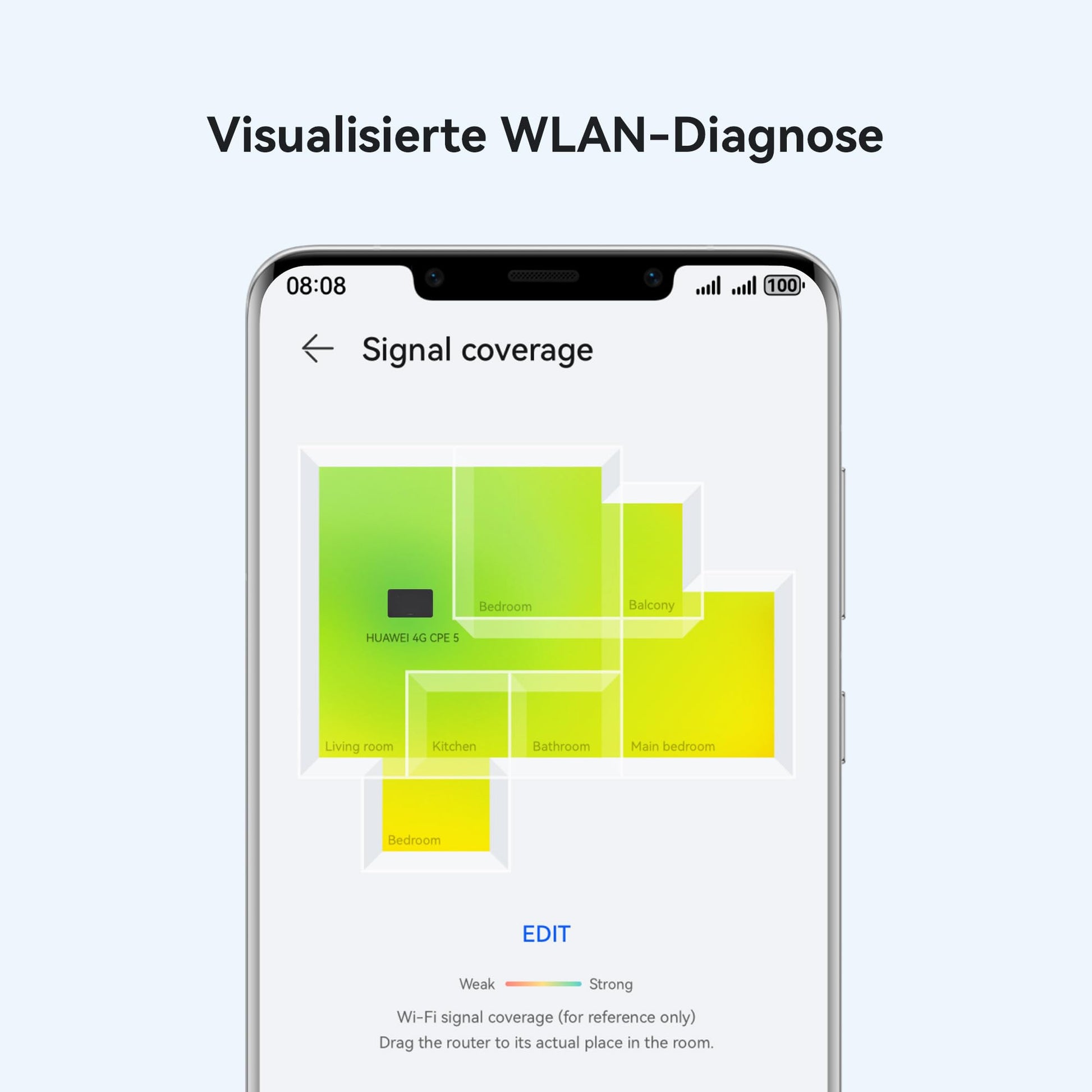 Mit dem Huawei 4G CPE 5 überwinden Sie die Grenzen langsamer Internetverbindungen. Dank der Unterstützung des LTE-Standards ist er die perfekte Alternative zu langsamem ADSL, vorausgesetzt, Sie haben eine gute 4G-Netzabdeckung. Die exklusive, visualisierte WLAN-Diagnosefunktion hilft auch technisch weniger versierten Personen, den Router optimal zu positionieren und die bestmögliche Signalstärke im ganzen Haus zu erzielen.