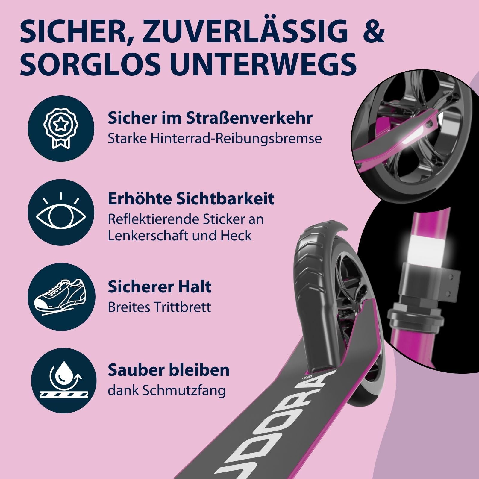 Egal ob Kind oder Erwachsener, der Scooter passt sich Ihnen an. Die verstellbare Lenkerhöhe und die hohe Tragkraft machen ihn zu einem vielseitigen Begleiter. Dabei hat Sicherheit stets oberste Priorität: Die zuverlässige Bremse und die Reflektoren gewährleisten jederzeit eine kontrollierte und sichere Fahrt.
