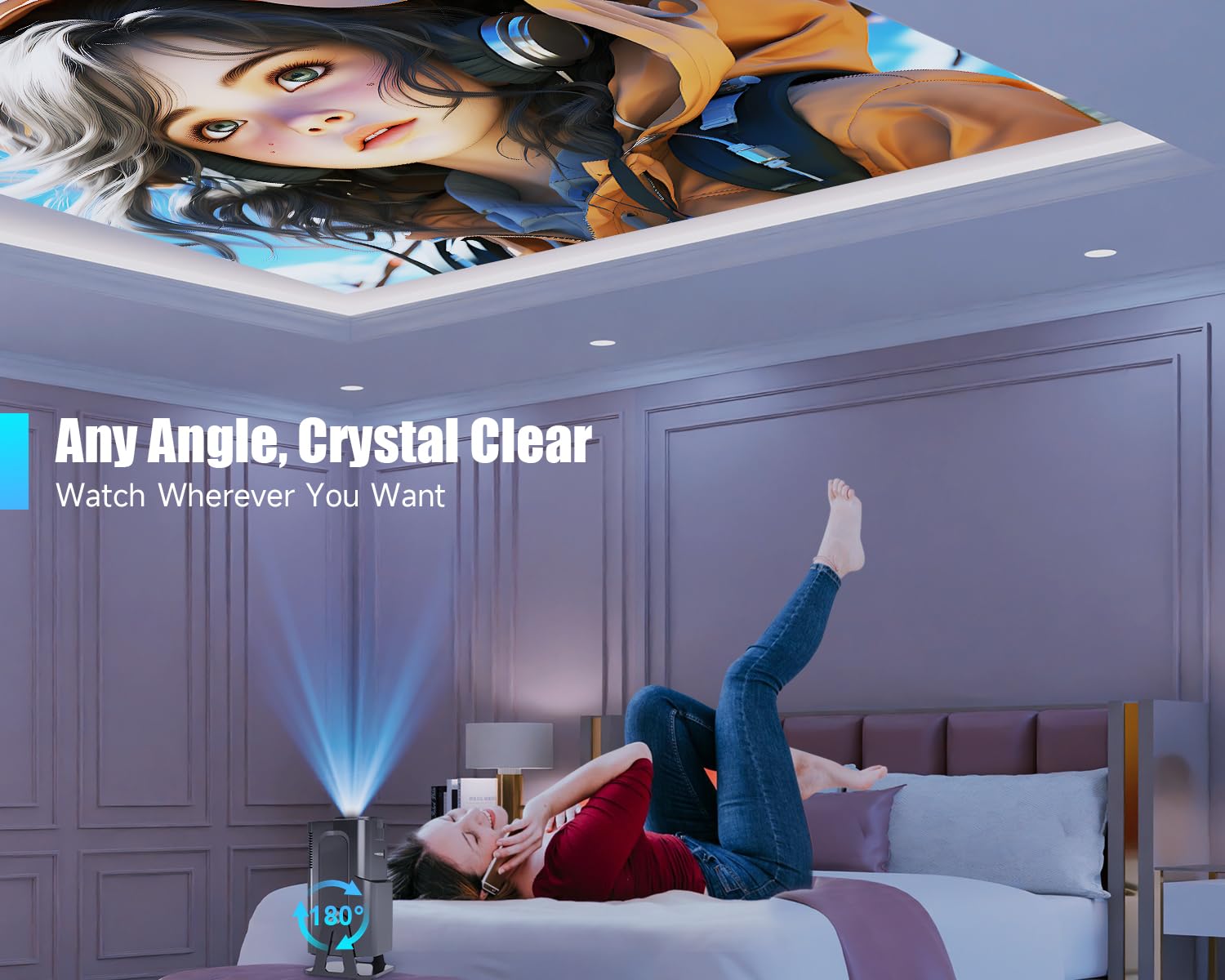 Mühelose Einrichtung und flexible Nutzung: Die Einrichtung ist ein Kinderspiel. Die intelligente Trapezkorrektur richtet das Bild automatisch aus, und mit dem Zoom (50%-100%) passen Sie die Grösse an, ohne den Projektor bewegen zu müssen. Der flexible Standfuss erlaubt es Ihnen, das Bild sogar an die Decke zu projizieren – ideal für Filmabende im Bett.