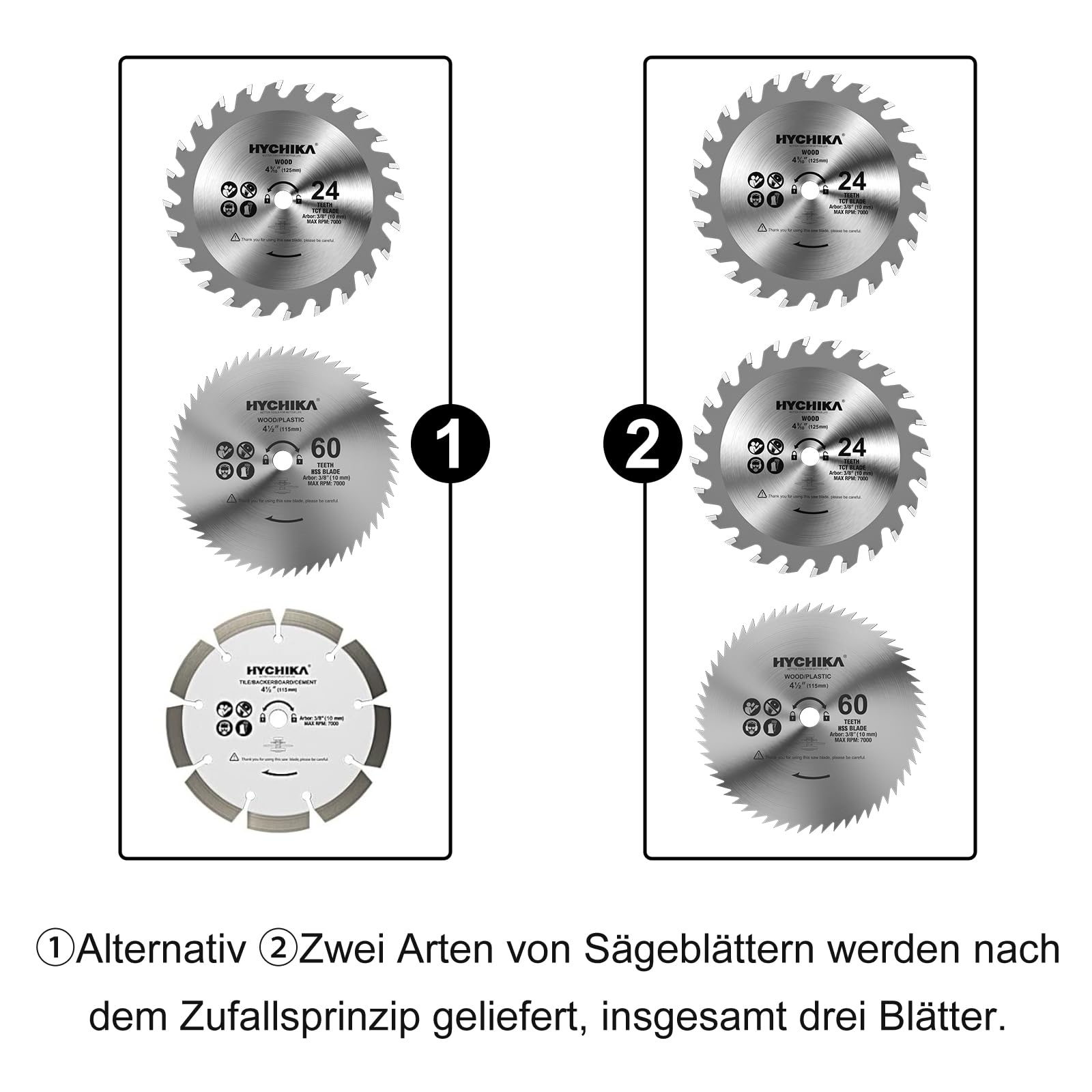 - Hinweis: Die mitgelieferten Sägeblätter können in ihrer Konfiguration variieren (z.B. 2x 24T und 1x 60T), Sie erhalten jedoch stets drei einsatzbereite Blätter.