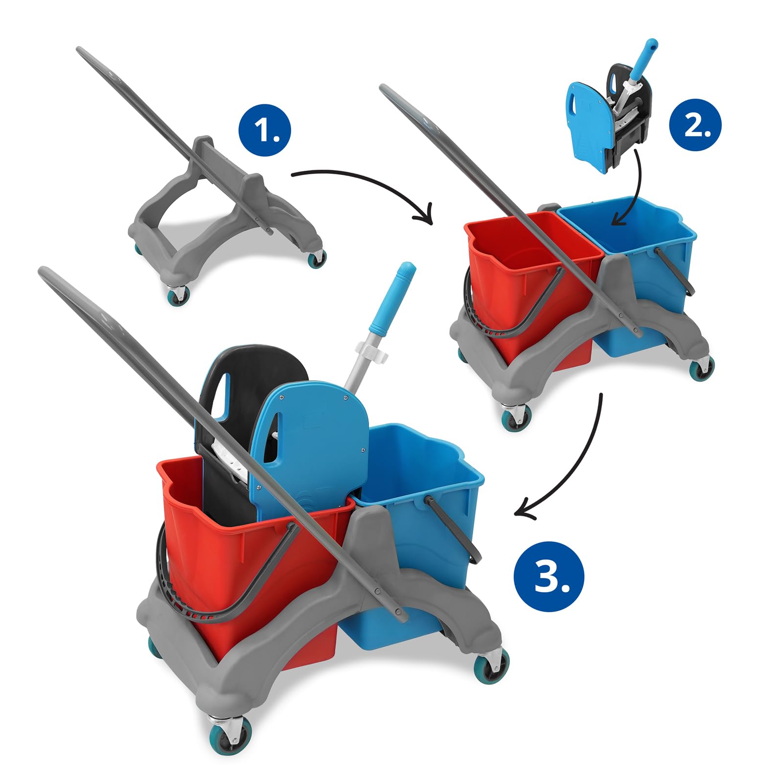 Der Wagen verfügt über ein Zwei-Eimer-System (ein roter und ein blauer 25-Liter-Eimer) zur strikten Trennung von sauberem Frischwasser und Schmutzwasser. Dies verhindert die Verteilung von Keimen und garantiert eine durchgehend hygienische Reinigung, da der Boden stets mit frischer Reinigungslösung gewischt wird.