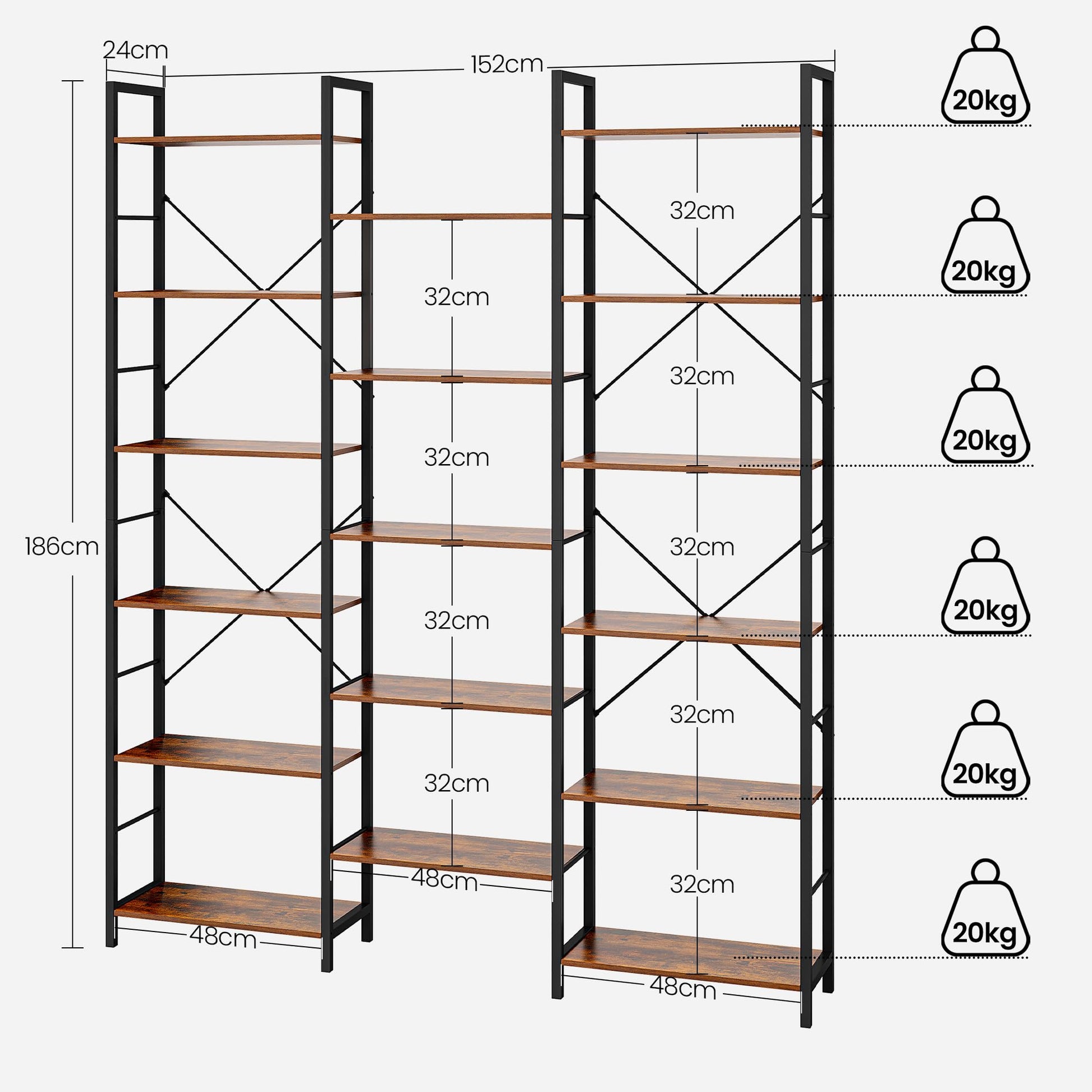 Das Standregal misst 152 cm in der Breite, 24 cm in der Tiefe und 186 cm in der Höhe. Die Gesamttragfähigkeit beträgt beeindruckende 340 kg, wobei jeder der 17 einzelnen Fachböden mit bis zu 20 kg belastet werden kann.