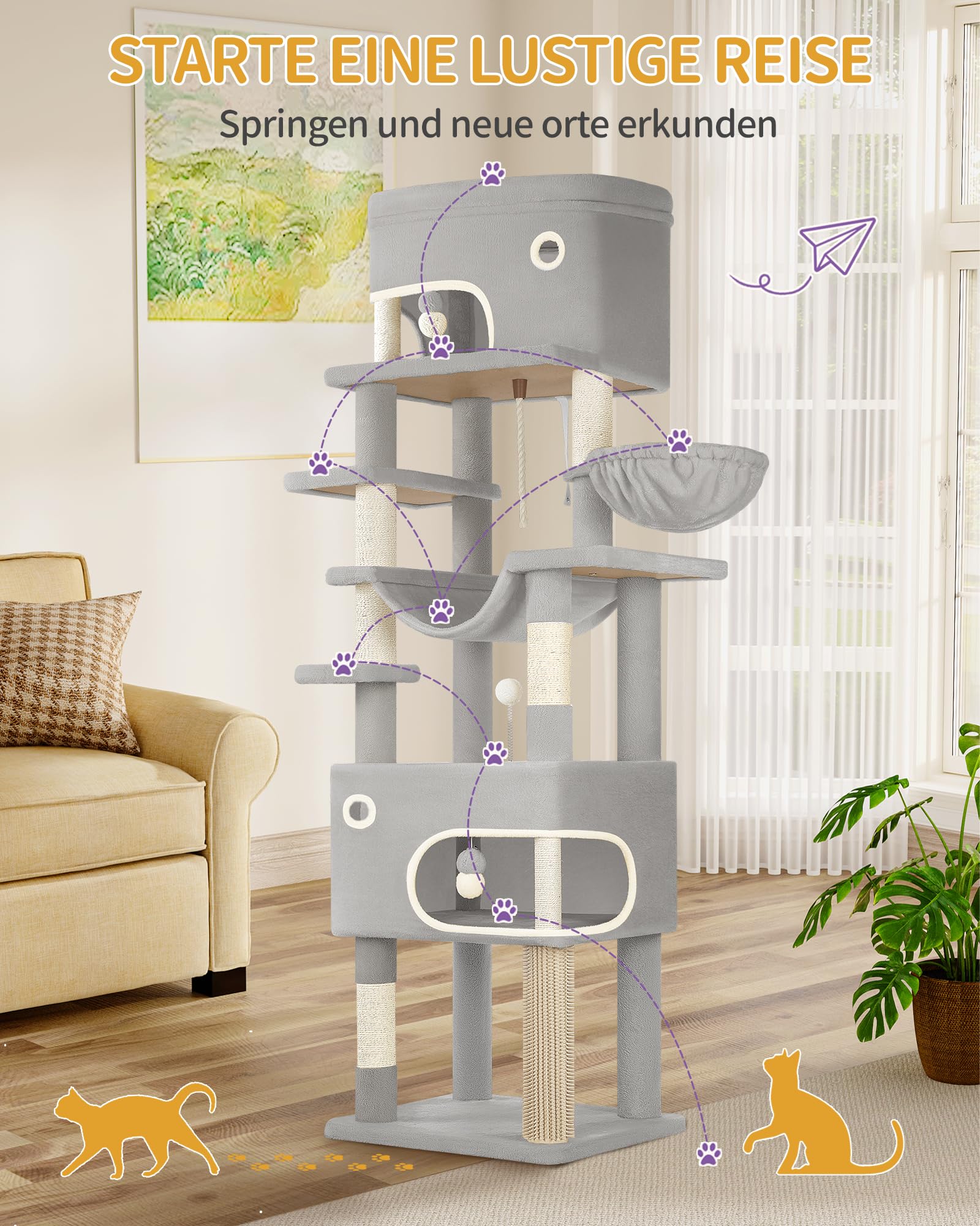 - Umfangreiche Kratzmöglichkeiten: Sieben robuste, mit Sisal umwickelte Stämme und ein zusätzliches Sisalseil verteilen sich über alle Etagen, um den natürlichen Kratztrieb Ihrer Katze zu befriedigen und Ihre Möbel zu schonen.
