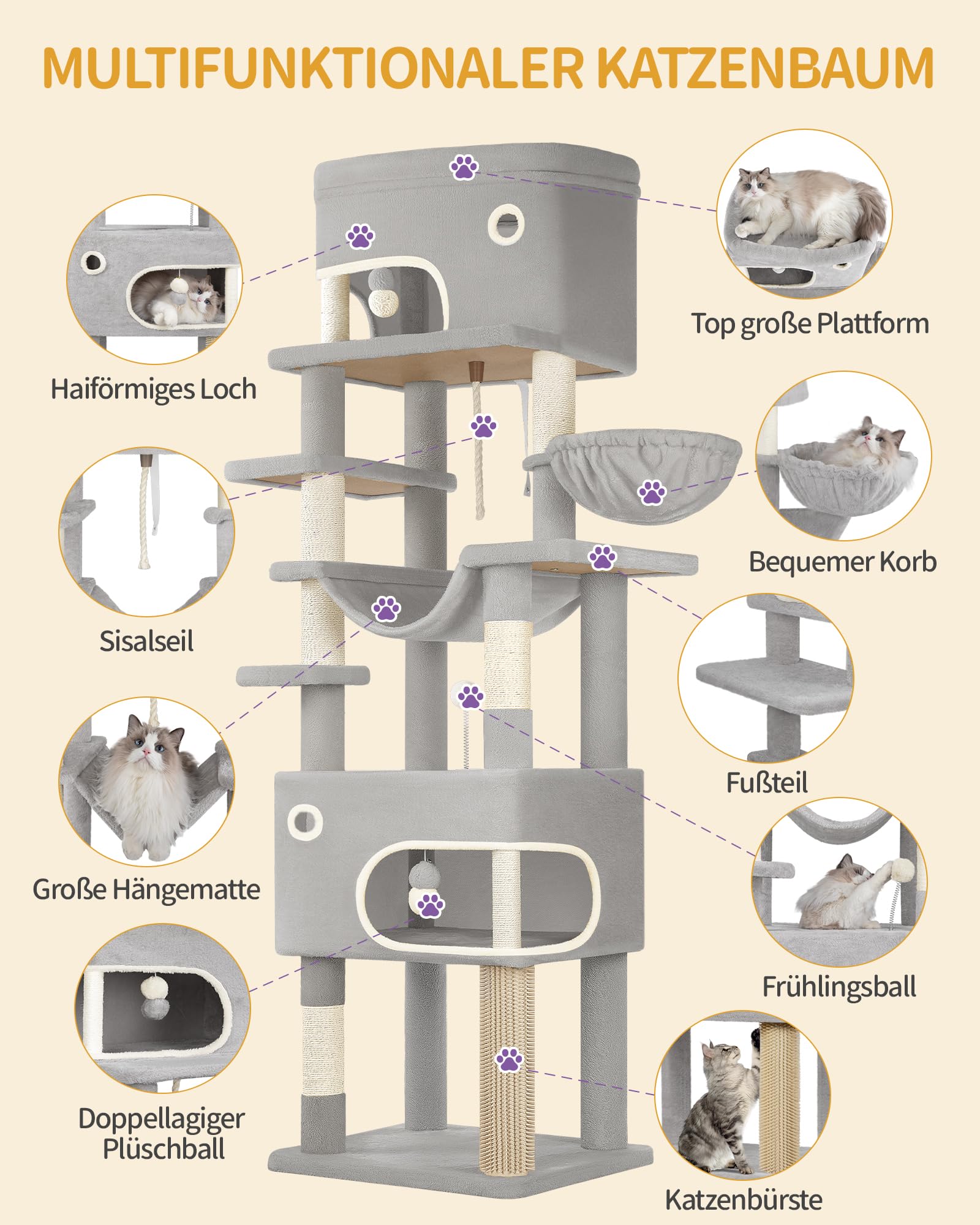 Dieser vielseitige Kratzbaum ist ein wahres Paradies für Ihre Katzen und bietet auf sieben Ebenen alles, was das anspruchsvolle Katzenherz begehrt – vom Klettern über das Kratzen bis hin zum gemütlichen Entspannen.