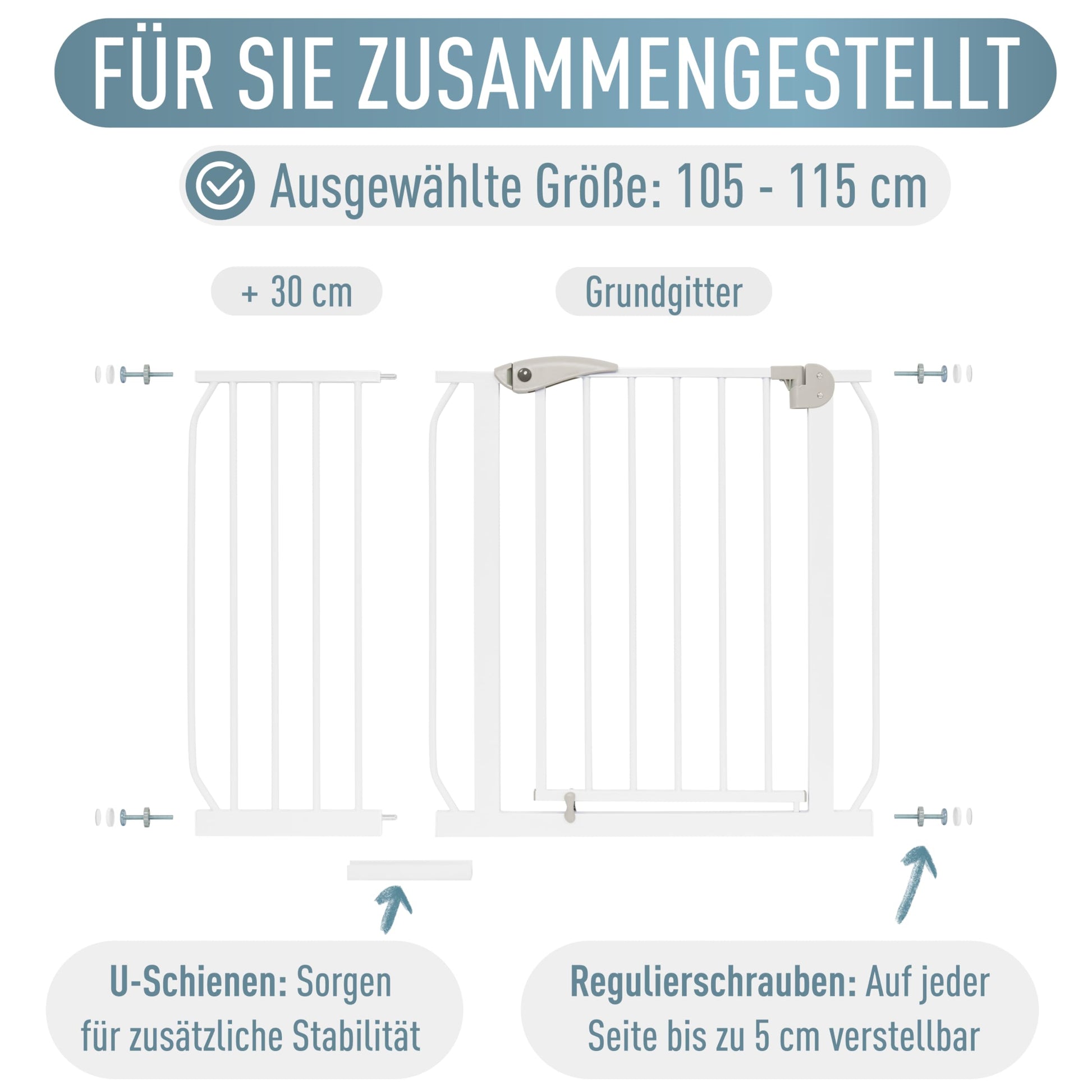 Dieses Modell passt sich flexibel an Durchgänge mit einer Breite von 105 bis 115 cm an. Für die Befestigung an Treppengeländern mit runden Stäben können Sie die normalen Regulierschrauben einfach durch separat erhältliche Y-Spindeln ersetzen, um einen sicheren Halt zu gewährleisten.