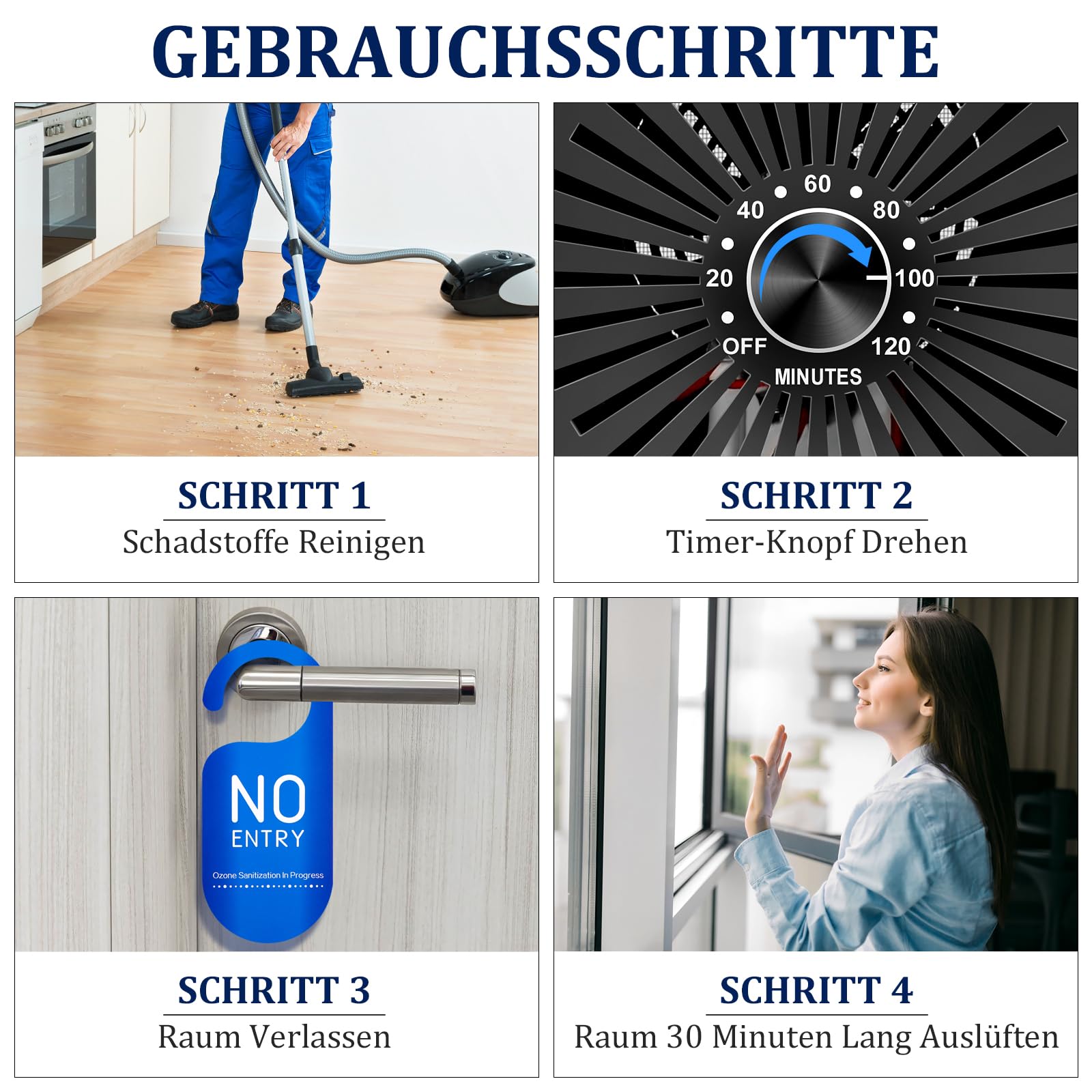 Die Dauer hängt von der Raumgrösse und Geruchsintensität ab und kann mit dem 120-Minuten-Timer eingestellt werden. Nach dem Reinigungsvorgang sollten Sie den Raum für weitere 30-60 Minuten geschlossen halten, damit das Ozon zerfallen kann. Lüften Sie den Raum anschliessend gründlich, bevor Sie ihn wieder nutzen.