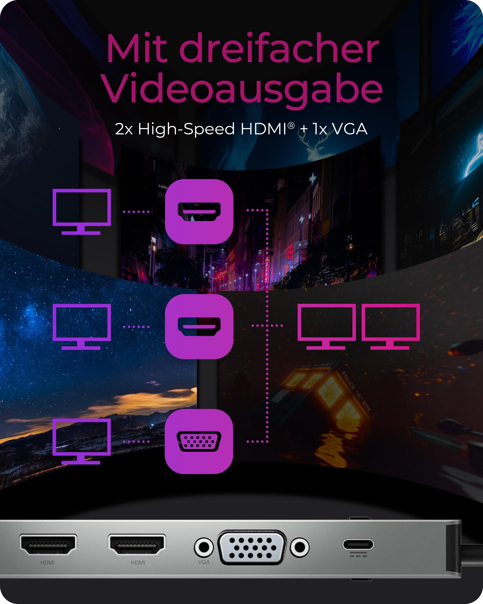 Sie verwandelt Ihren Laptop über einen einzigen USB-C-Anschluss in eine vollwertige Workstation. Sie bündelt 11 wichtige Anschlüsse, darunter Videoausgänge für bis zu zwei Monitore (2x HDMI, 1x VGA), Gigabit-LAN und mehrere USB-Ports, wodurch Sie Kabelsalat reduzieren und die Funktionalität Ihres Geräts massiv erweitern.