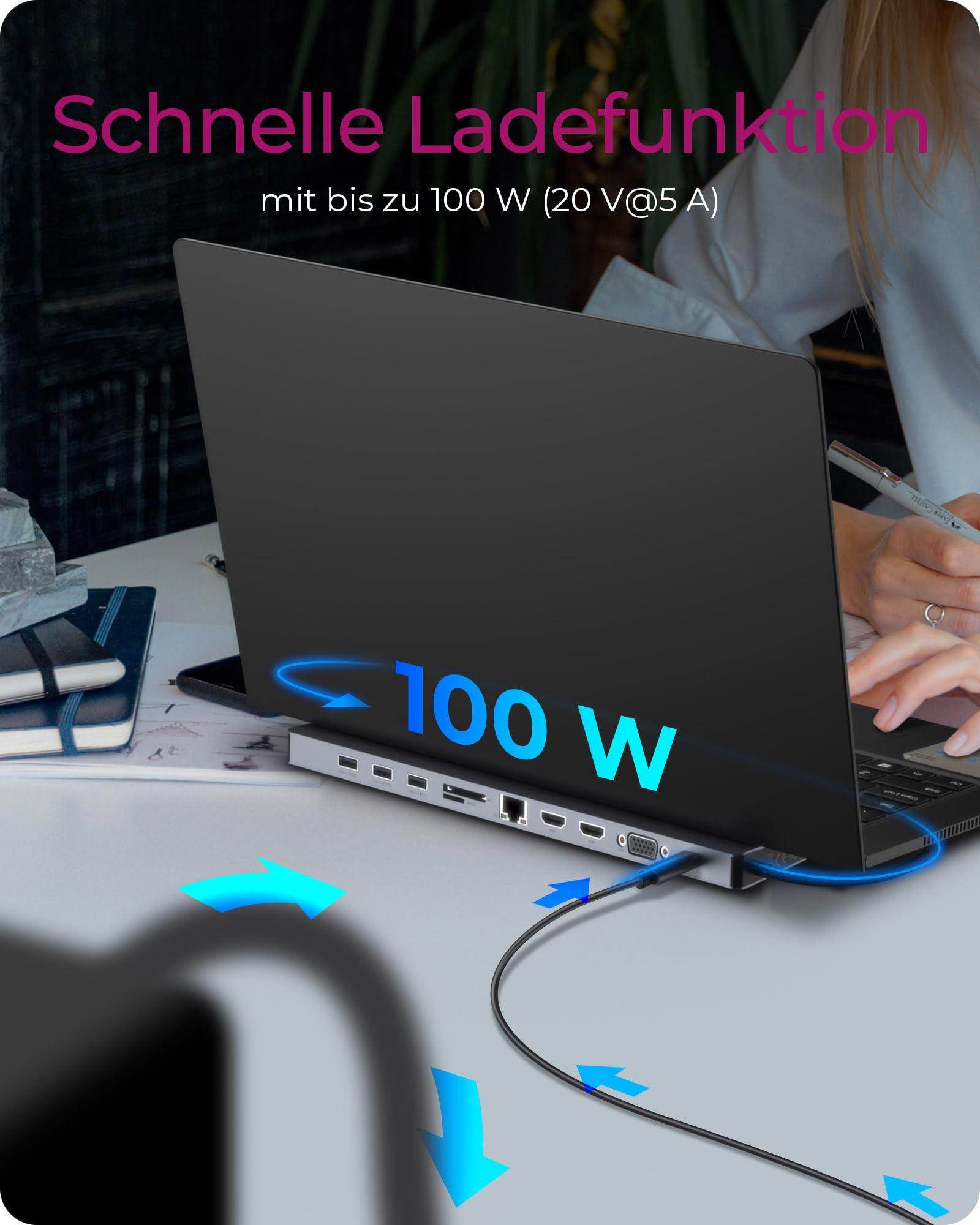- Leistungsstarke Stromversorgung: Unterstützt Power Delivery mit bis zu 100 Watt über den USB-C Port, um Ihr Notebook während des Betriebs zuverlässig aufzuladen (setzt ein angeschlossenes Notebook-Netzteil an der Docking Station voraus).