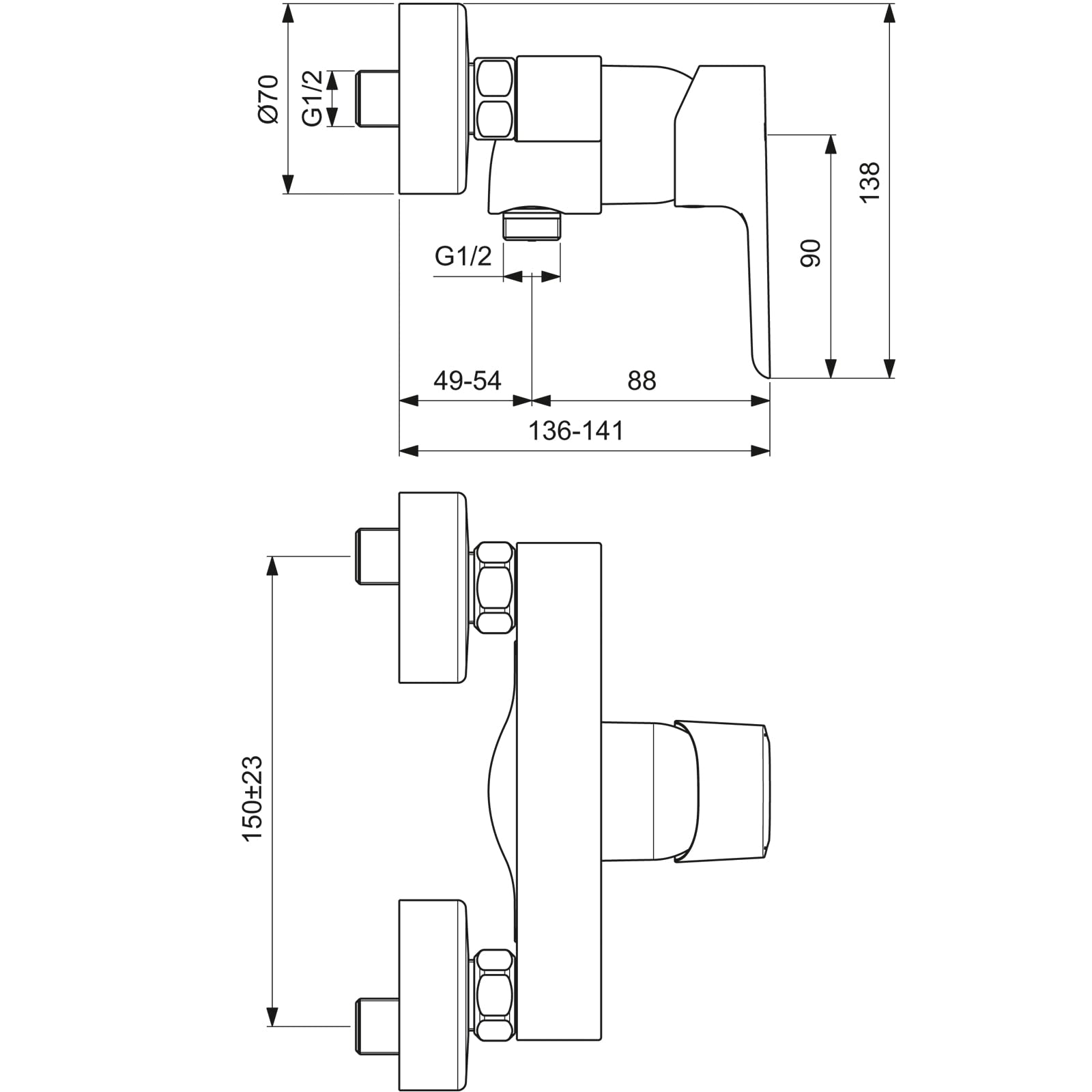Die Montage erfolgt als Aufputz-Installation. Alles Nötige ist im Lieferumfang enthalten: die Armatur, zwei Rosetten (Ø 70 mm) und die S-Anschlüsse. Diese S-Anschlüsse ermöglichen eine einfache Montage an das in Deutschland übliche Standard-Anschlussmass von 150 mm.