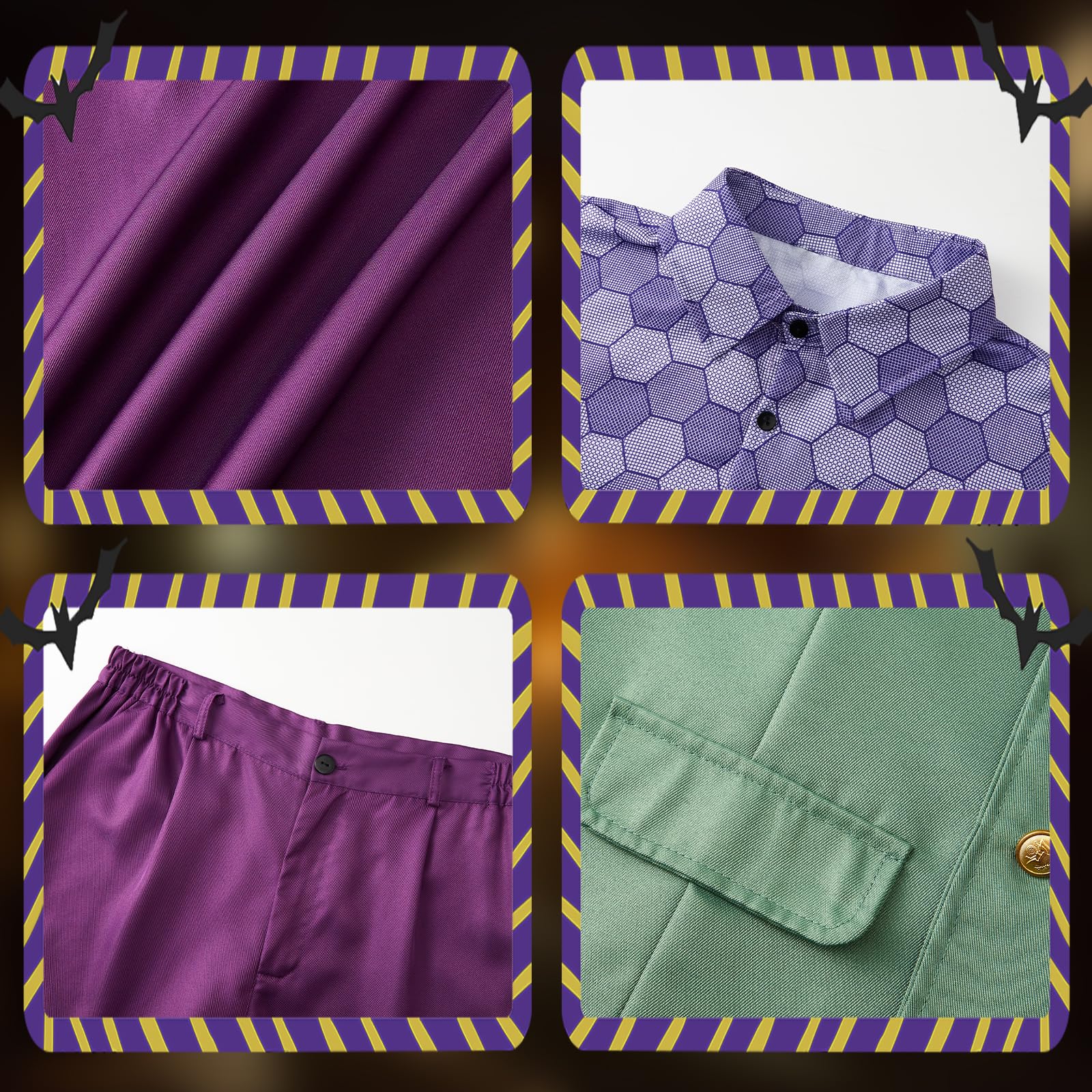 Das Set beinhaltet alles für den authentischen Look: einen lila Mantel, eine grüne Weste, eine passende Hose, eine Krawatte, Handschuhe und einen separaten Hemdkragen. Bitte beachten Sie, dass Perücke, Schuhe und Make-up nicht im Lieferumfang enthalten sind.