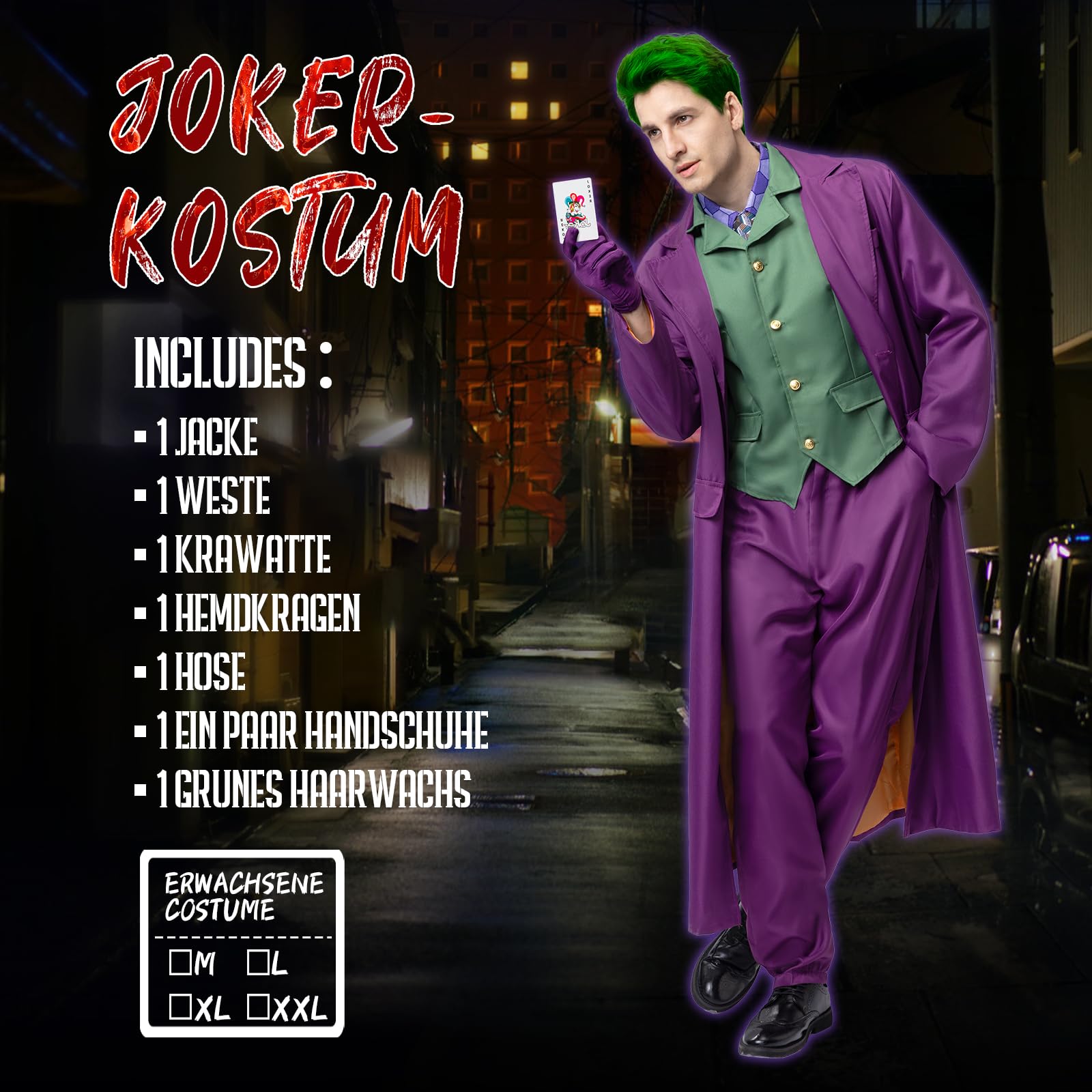Verwandeln Sie sich in den ikonischen Meister des Chaos mit diesem kompletten Joker-Kostüm für Herren. Dieses Set bietet alles, was Sie für einen unvergesslichen und authentischen Auftritt an jeder Kostümparty benötigen.