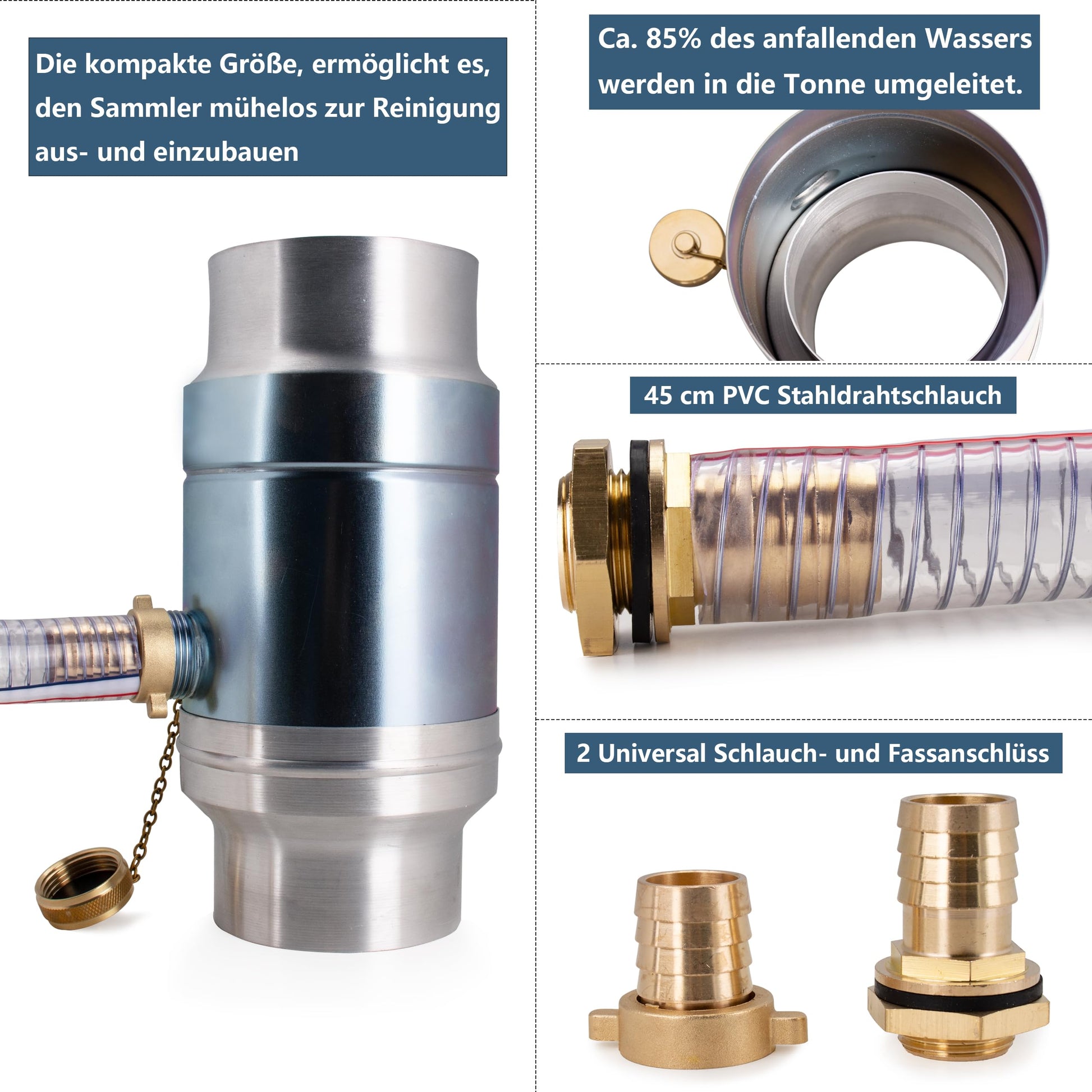 Dieser hochwertige Regenwassersammler aus verzinktem Stahlblech und Aluminium ermöglicht eine einfache und nachhaltige Nutzung von Regenwasser. Er ist speziell für Fallrohre mit einem Durchmesser von 100 mm konzipiert und leitet das Wasser effizient in Ihre Regentonne.