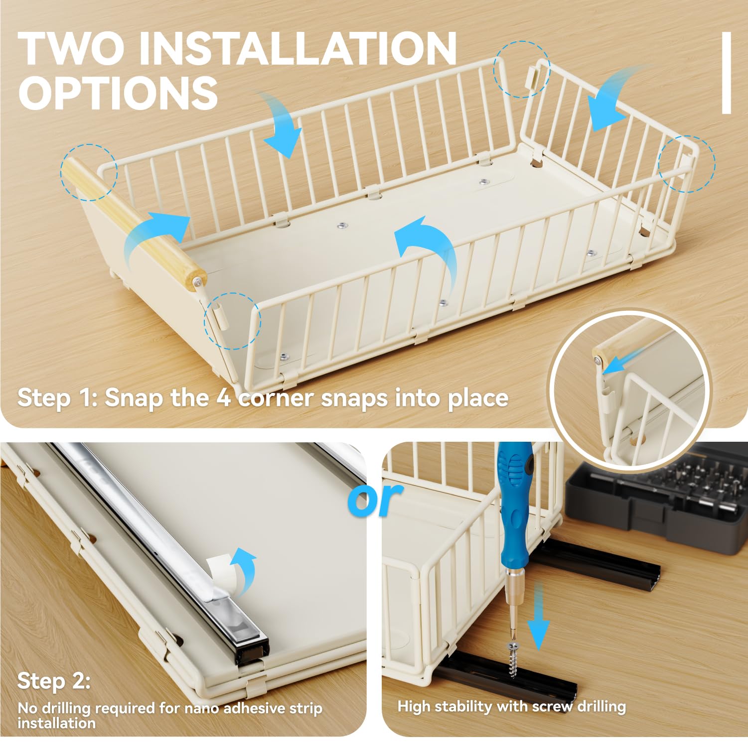 Sie haben die Wahl! Für maximale Stabilität können Sie die Schubladen mit den mitgelieferten Nägeln festschrauben, was Bohren erfordert. Wenn Sie Ihre Schränke nicht beschädigen möchten, können Sie stattdessen das ebenfalls enthaltene, stark haftende Nano-Klebeband für eine bohrfreie Montage verwenden.
