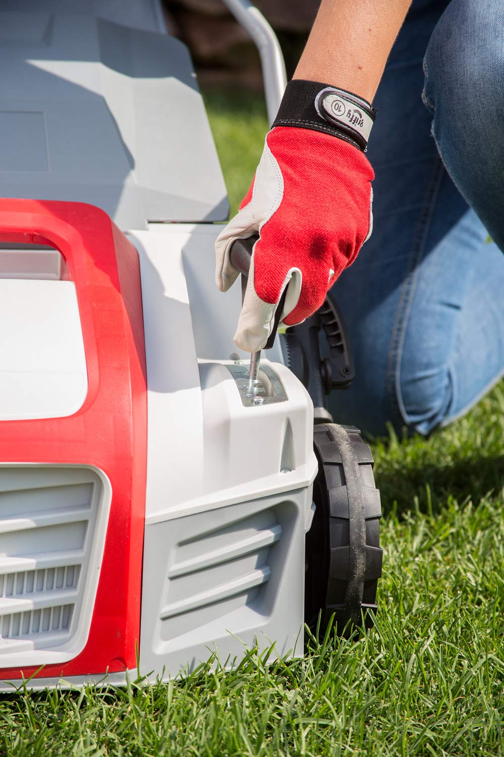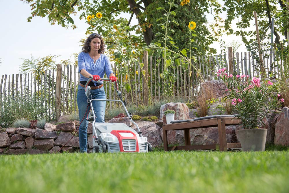 - Einfache Handhabung: Der werkzeuglose Walzenwechsel, grosse, rasenschonende Räder und ein integrierter Tragegriff sorgen für hohen Bedienkomfort.
