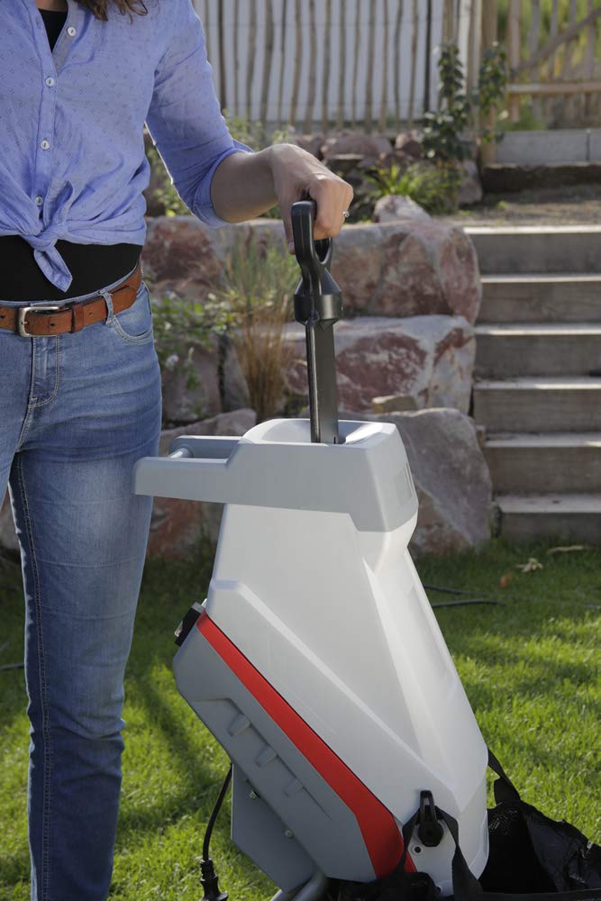 Die Mobilität kommt nicht zu kurz. Mit dem stabilen Fahrgestell und dem integrierten Tragegriff lässt sich der Häcksler bequem an jeden Einsatzort im Garten rollen. Nach getaner Arbeit kann er ebenso einfach und platzsparend in der Garage oder im Gartenhaus verstaut werden. Das zerkleinerte Material wird direkt im mitgelieferten 45-Liter-Fangsack aufgefangen. Dieser lässt sich sicher am Gerät befestigen und dank der Tragegriffe bequem zum Komposthaufen oder zur Biotonne transportieren.