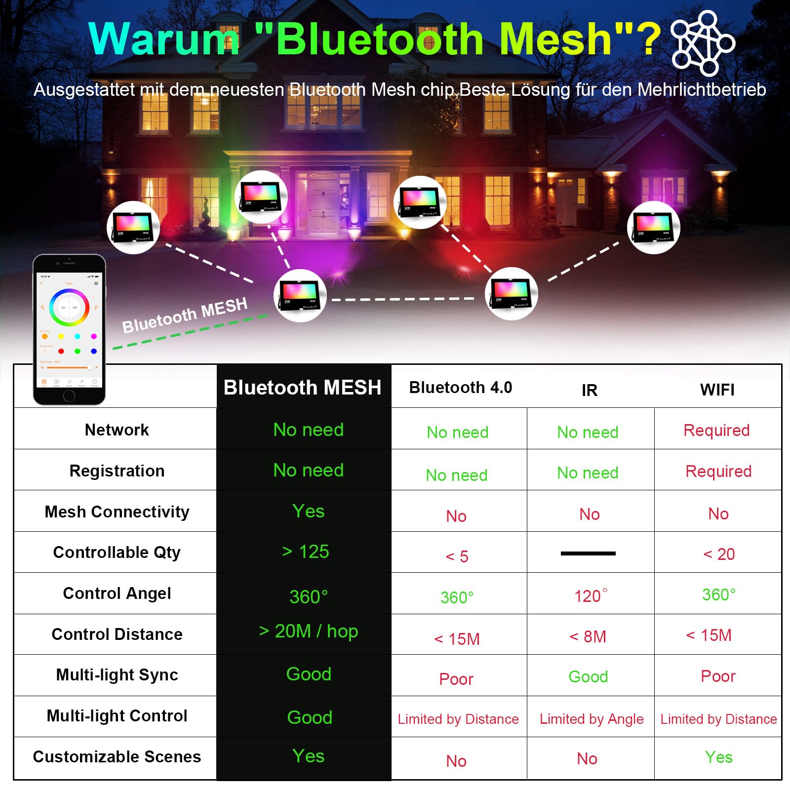 - Moderne Bluetooth Mesh 5.0 Technologie für eine stabile und reichweitenstarke Verbindung ohne WLAN-Netzwerk.