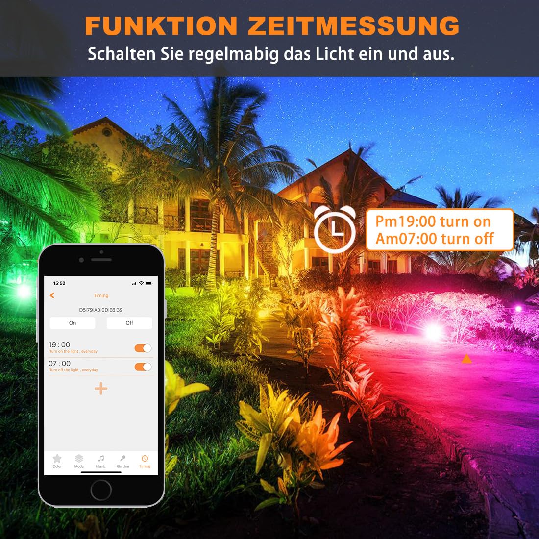 Die präzise Timer-Funktion erlaubt es Ihnen, feste Zeitpläne für Ihre Beleuchtung zu erstellen. Lassen Sie Ihren Garten jeden Abend um 18:00 Uhr in Ihrer Lieblingsfarbe erstrahlen und sich um 23:00 Uhr automatisch wieder ausschalten. So geniessen Sie stimmungsvolles Licht, ohne sich Gedanken über das Ein- und Ausschalten oder Ihre Stromrechnung machen zu müssen.