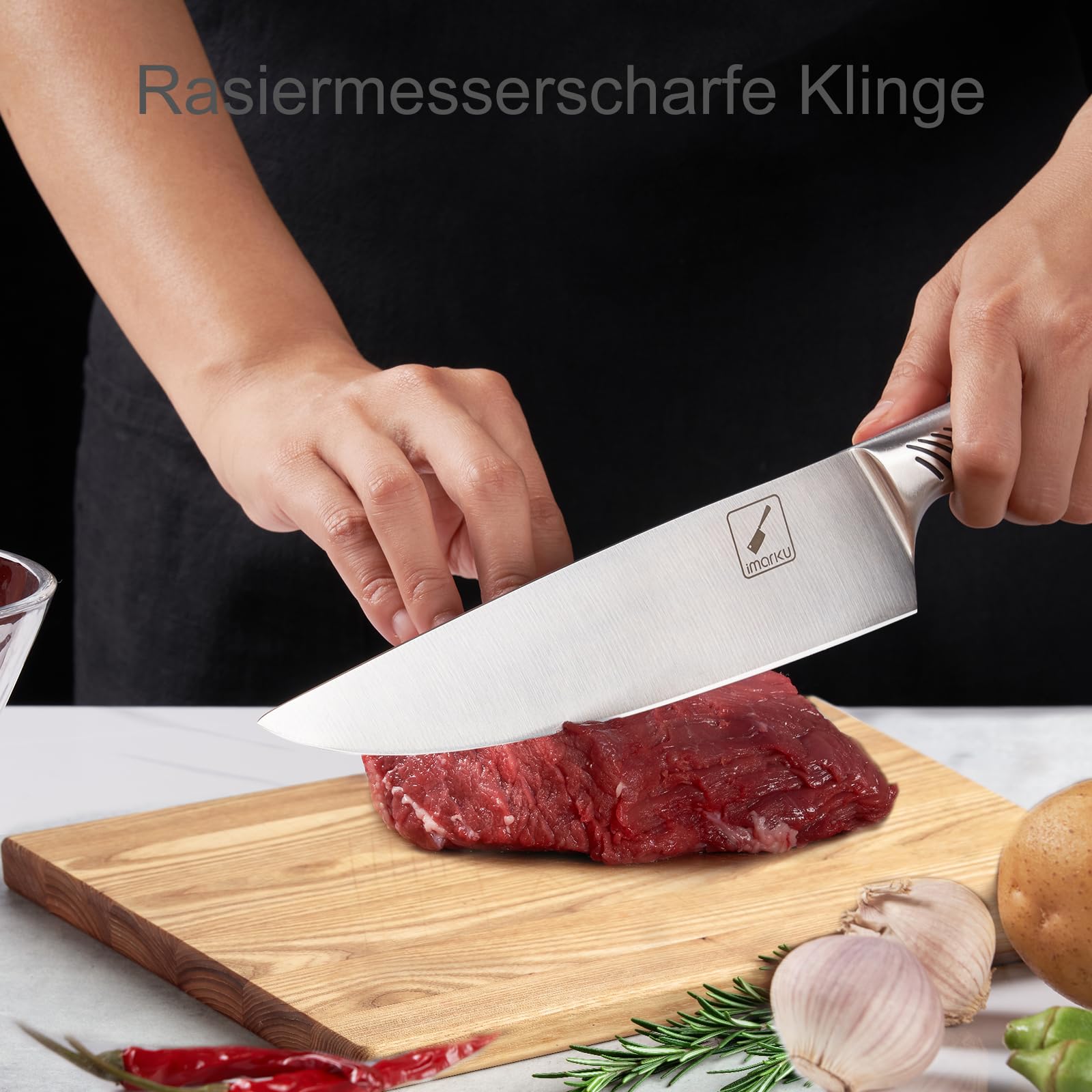 Dieses umfassende 14-teilige Messerset ist die professionelle Komplettausstattung für jede Küche. Es kombiniert hochwertige Materialien, durchdachte Funktionalität und ein modernes Design, um Ihnen bei allen Schneidarbeiten höchste Präzision zu ermöglichen.