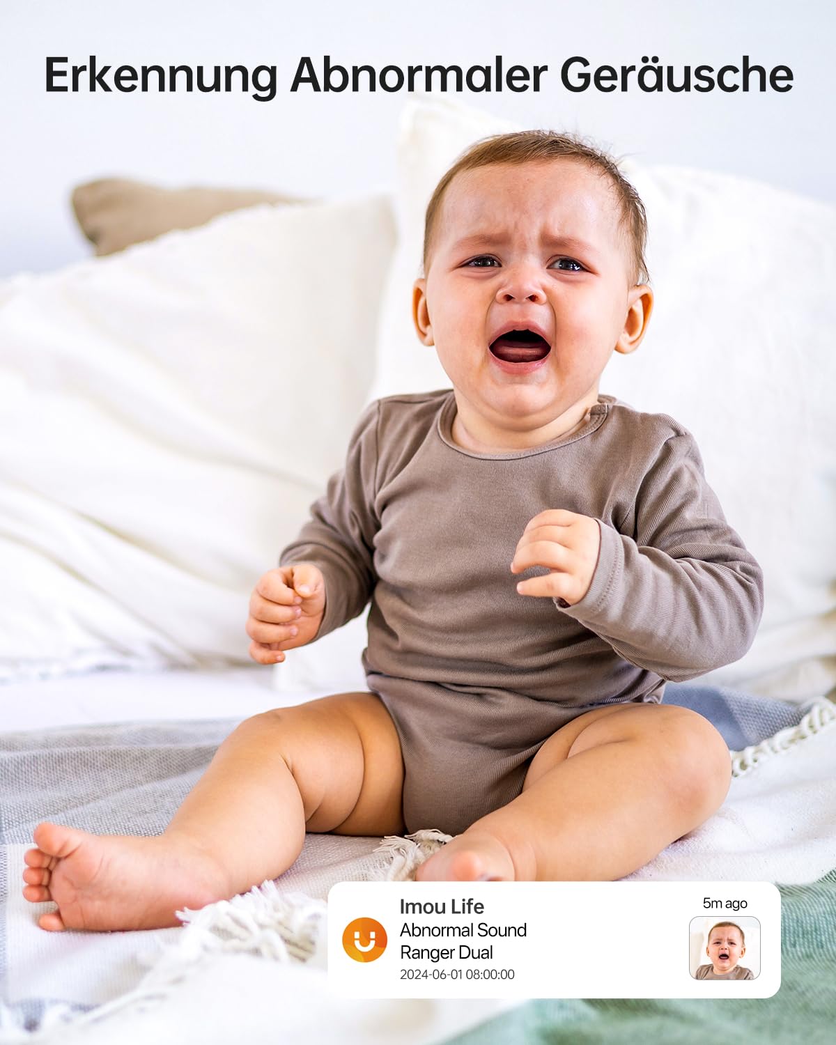 Die KI-Technologie unterscheidet präzise zwischen Menschen und Haustieren, was Fehlalarme durch Insekten oder Schatten um 99 % reduziert. Sie erhalten nur relevante Benachrichtigungen. Zusätzlich erkennt die Kamera Geräusche wie Babyweinen oder Hundegebell und informiert Sie auch darüber.