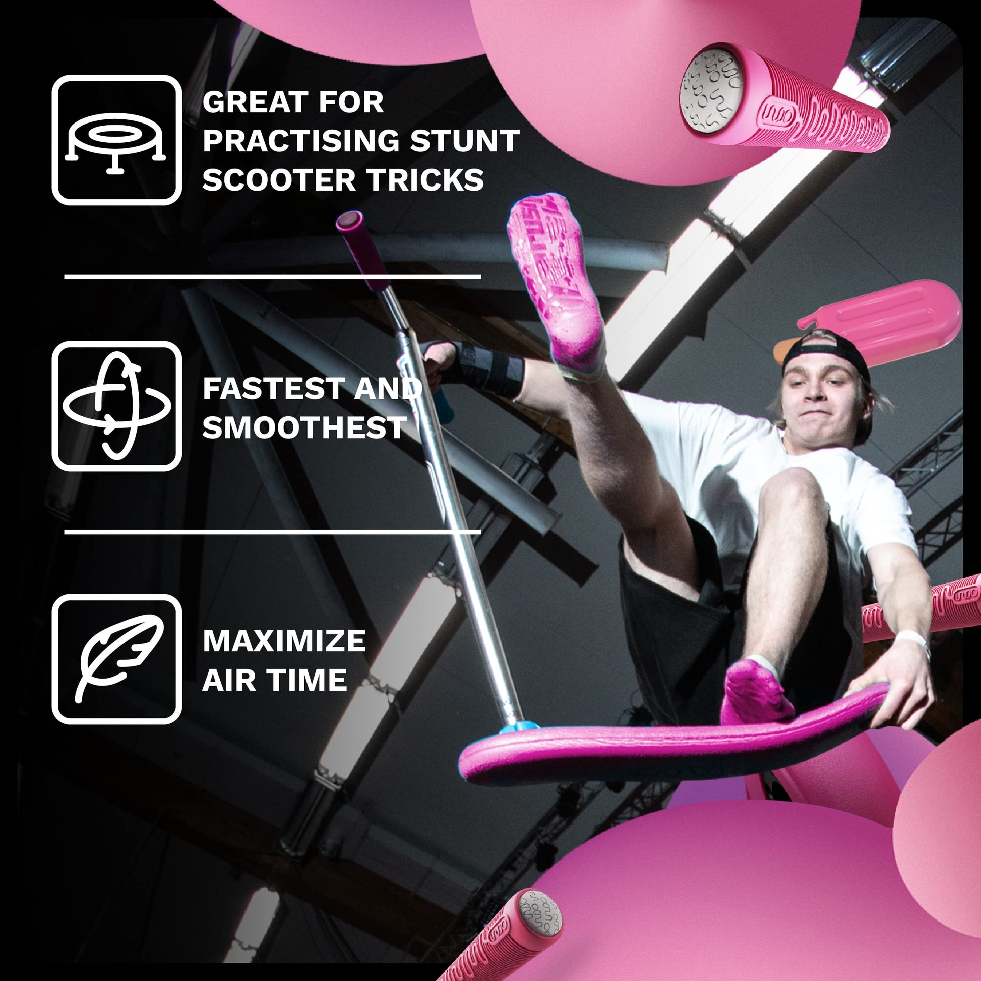 Entdecken Sie den ultimativen Trainingsscooter für aufstrebende und erfahrene Freestyle-Artisten. Dieses Modell in leuchtendem Pink wurde speziell für Jugendliche und Erwachsene entwickelt, um das Üben von Stunts zu revolutionieren.
