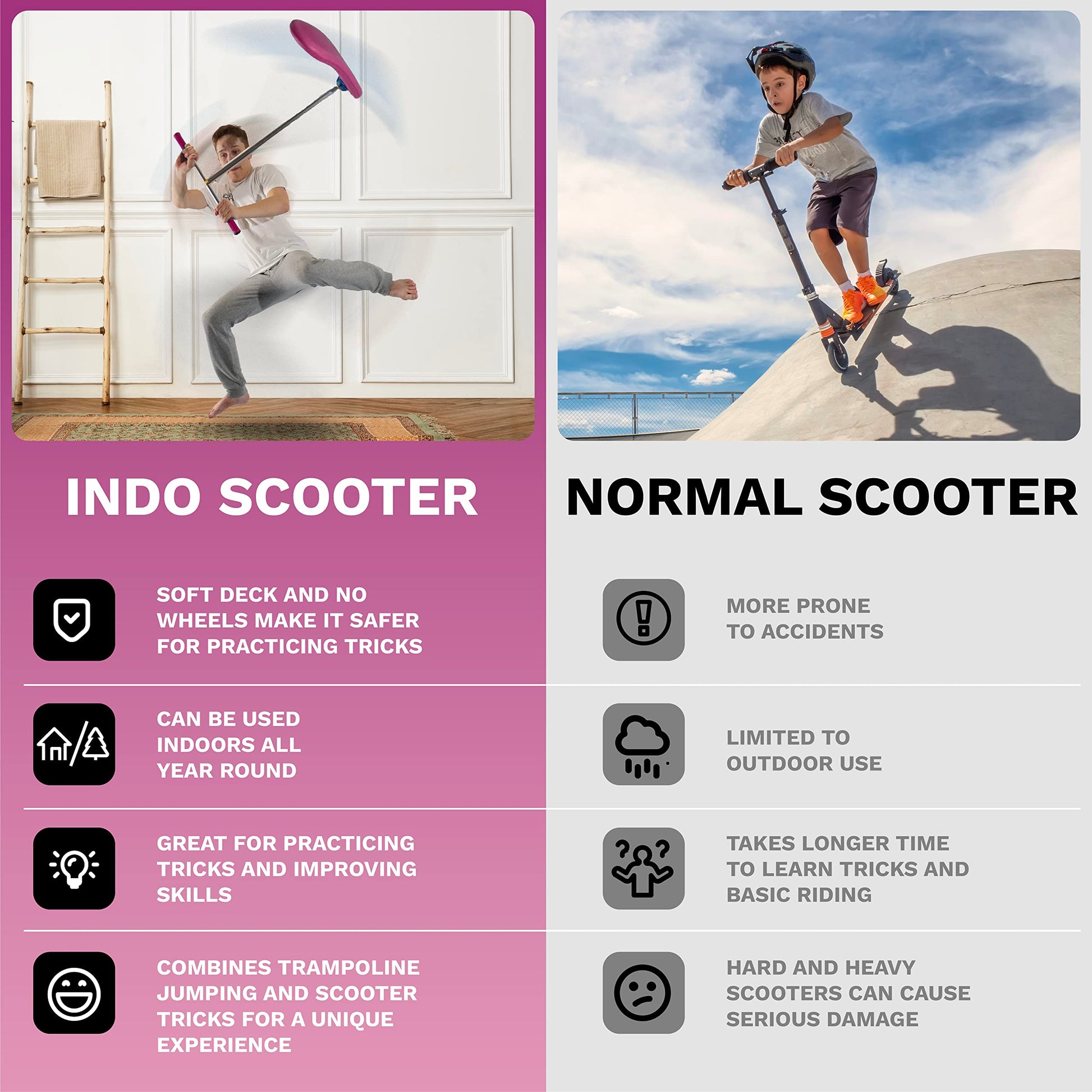 This is a specialized training scooter designed for indoor use. Its unique deck is engineered to be safely used on both trampolines and flat, smooth floors without causing any damage, making it perfect for practicing tricks at home.