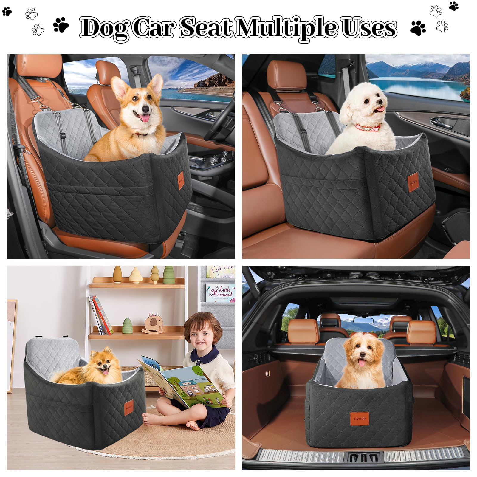 INDYBUD Hunde Autositz Erhöhter Memory-Schaum Sitz - Mittel, Schwarz Grau