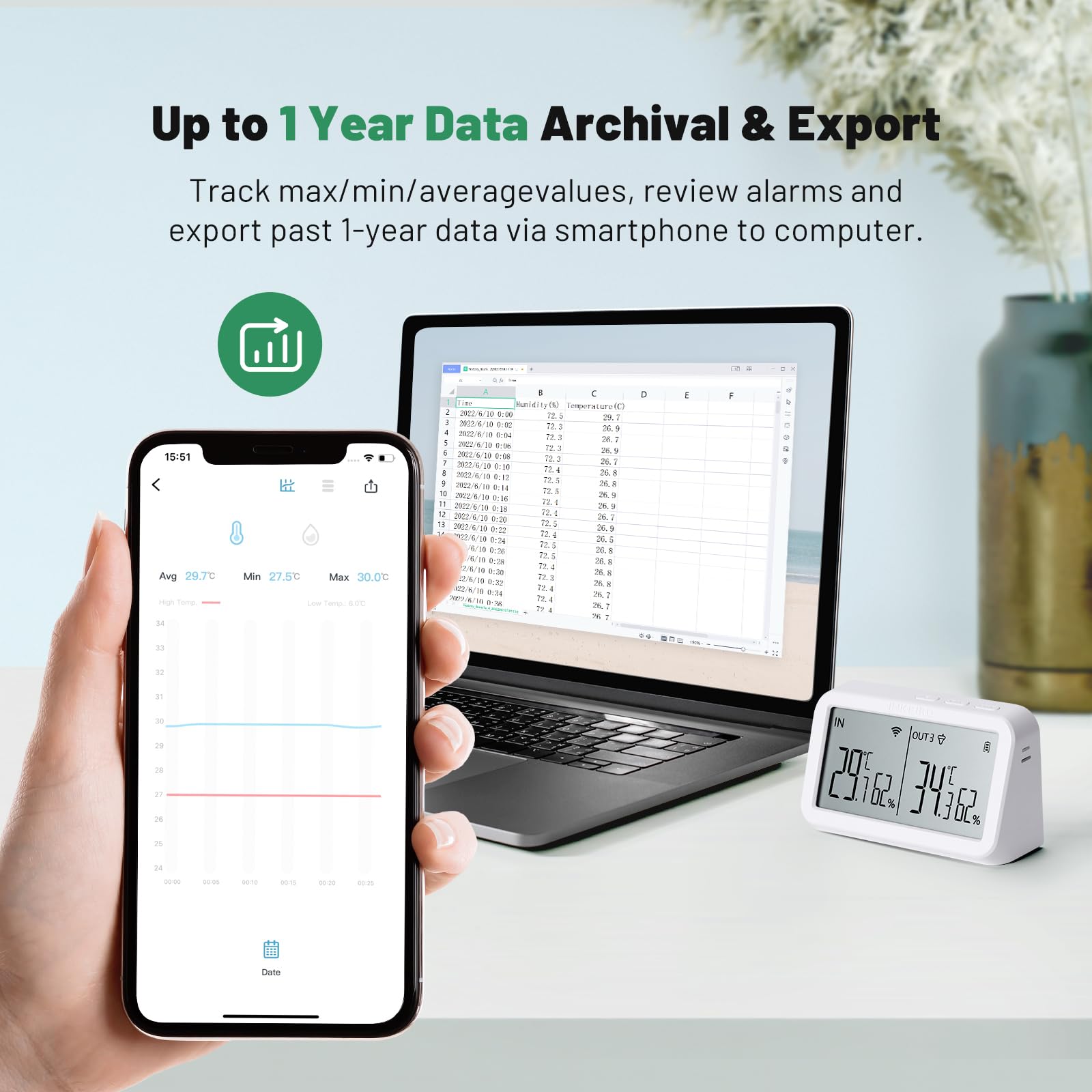 Der hochpräzise Sensor misst die Temperatur mit einer Genauigkeit von ±1°C. Die App zeichnet automatisch tägliche Minimal-, Maximal- und Durchschnittswerte auf und stellt diese in übersichtlichen Grafiken dar. Diese Daten werden bis zu einem Jahr gespeichert, sodass Sie Trends erkennen und z.B. den Energieverbrauch Ihrer Heizung optimieren können.