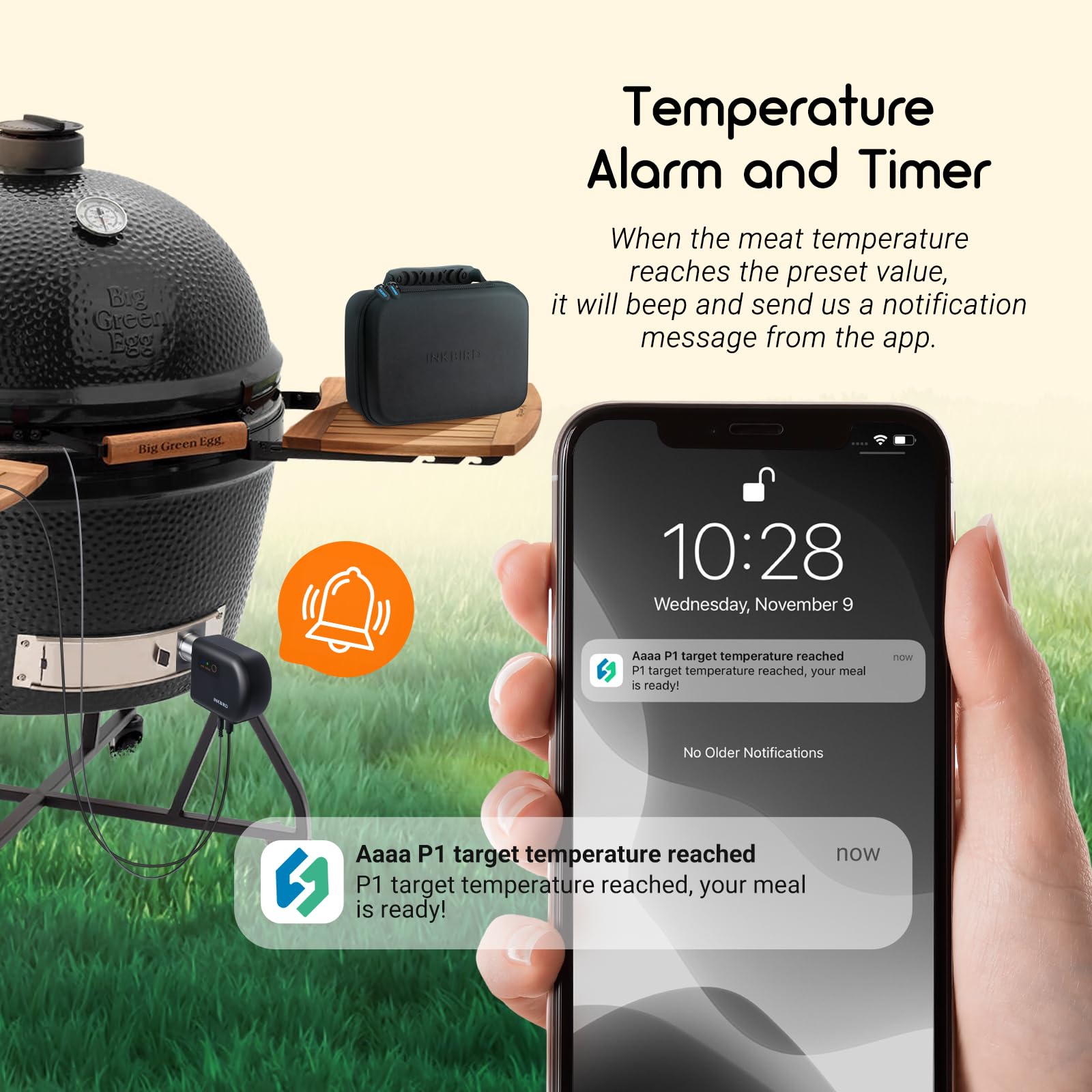 - Vollautomatische Temperatursteuerung: Ein hocheffizienter Lüfter passt seine Geschwindigkeit dynamisch an, um die von Ihnen eingestellte Grilltemperatur präzise zu halten. Zusätzlich können Sie Hoch- und Tieftemperaturalarme definieren, um die Sicherheit zu gewährleisten.