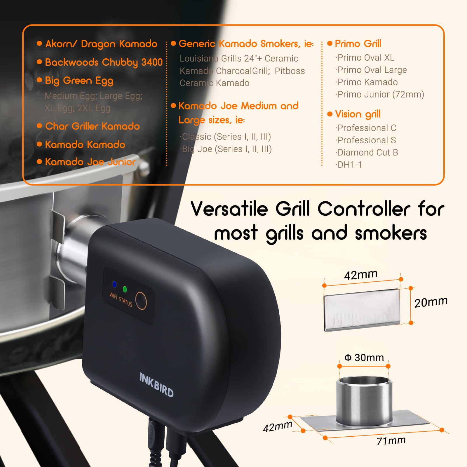 - Einfache und direkte Montage: Das Gerät wird ohne störende Schläuche direkt am Grill oder Smoker befestigt. Der mitgelieferte Universaladapter macht es mit den meisten Modellen kompatibel.