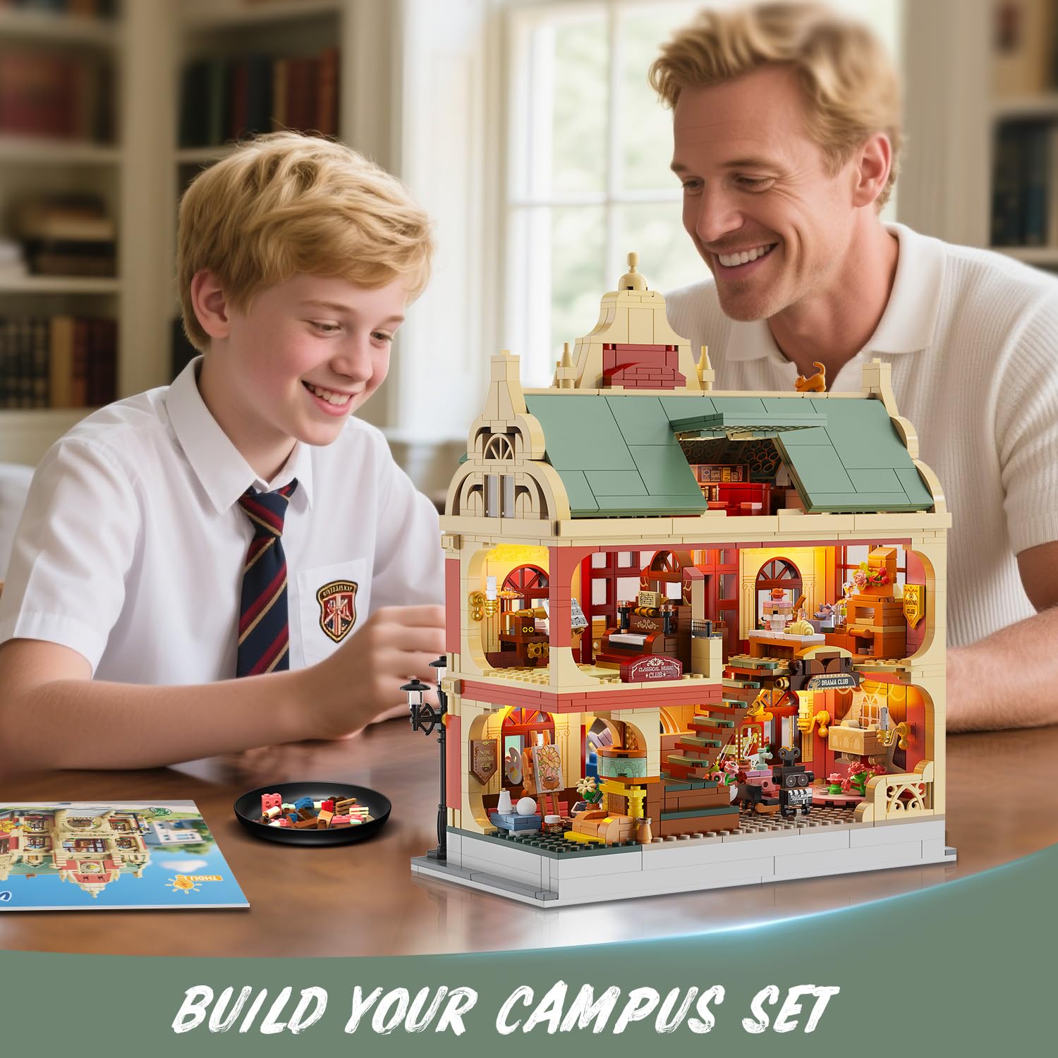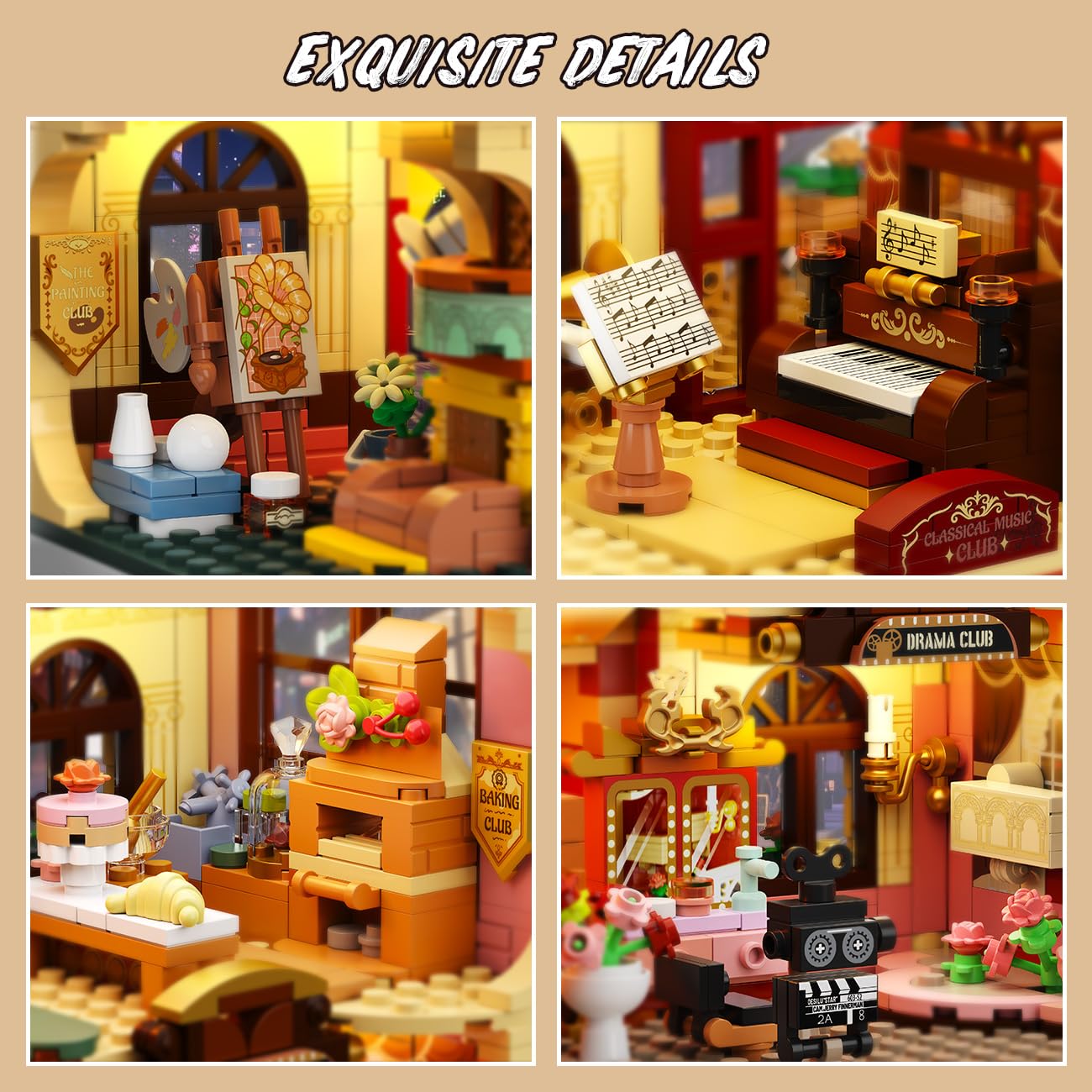 Ein Tauchgang in kreative Campus-Welten: Jeder Winkel dieses Architektur-Sets erzählt eine eigene Geschichte. Im Malkurs regen Farbpaletten und Modelle die Fantasie an, während im Theaterclub Schminkspiegel und Filmklappe für Probenstimmung sorgen. Im Obergeschoss schaffen ein klassisches Klavier und ein Plattenspieler eine nostalgische Atmosphäre, und aus dem Backclub scheint der Duft von frischen Torten zu strömen. Die Fülle an Details sorgt für ein immersives Bau- und Spielerlebnis.