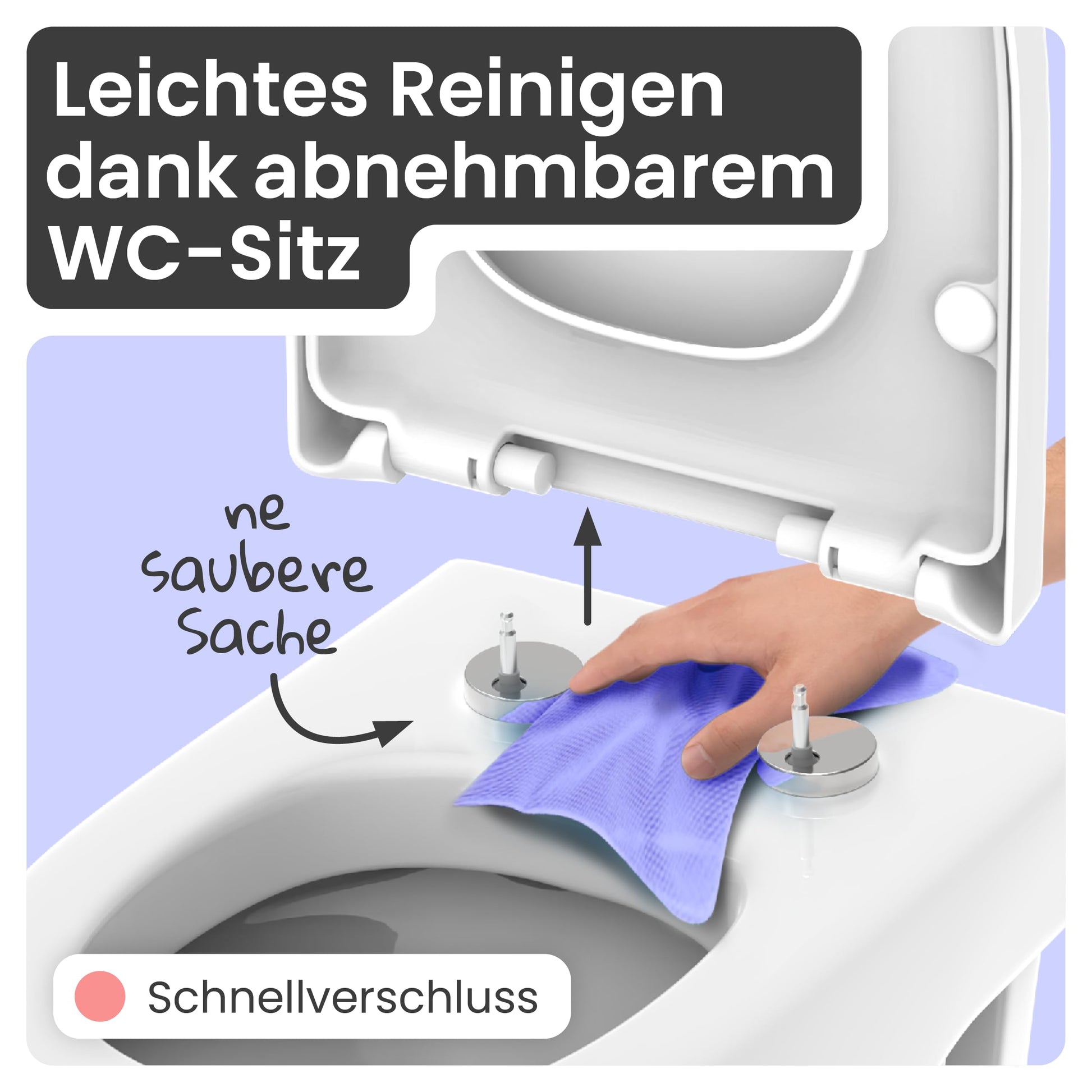Die Reinigung ist sehr einfach. Dank der glatten, porenfreien Duroplast-Oberfläche lässt er sich mühelos abwischen. Für eine besonders gründliche Reinigung kann der gesamte Sitz durch die Quick-Release-Funktion (Take-Off) mit nur einem Handgriff von der Keramik abgenommen werden, um auch schwer zugängliche Stellen zu erreichen.