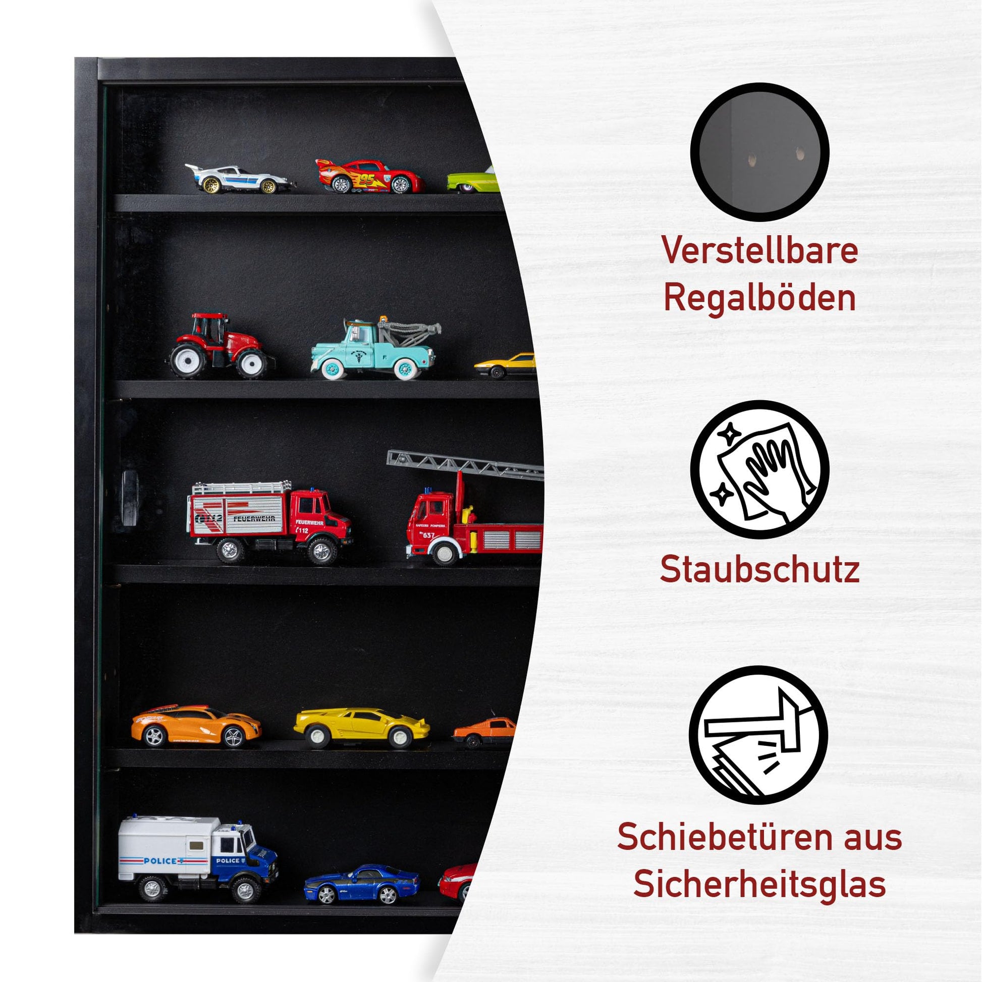 Die Vitrine enthält vier Einlegeböden, die Sie in der Höhe frei verstellen können. So können Sie den Innenraum perfekt an die Grösse Ihrer Sammlerstücke anpassen, ideal für Modellautos, Sammelfiguren, Münzen, Schmuck oder andere Kostbarkeiten.