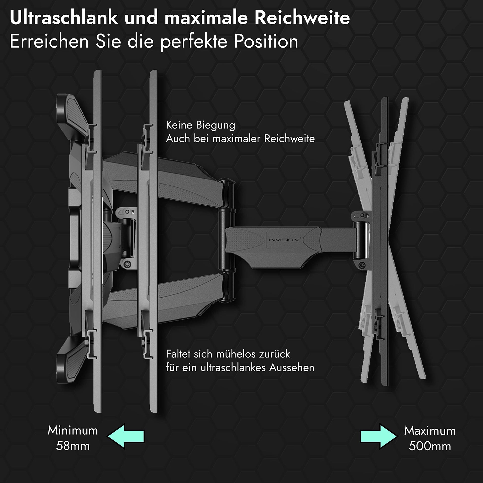 - Schlankes Design mit grosser Reichweite: Mit einem minimalen Wandabstand von nur 58 mm fügt sich die Halterung dezent in Ihren Wohnraum ein. Bei Bedarf lässt sie sich stufenlos auf bis zu 500 mm ausziehen.