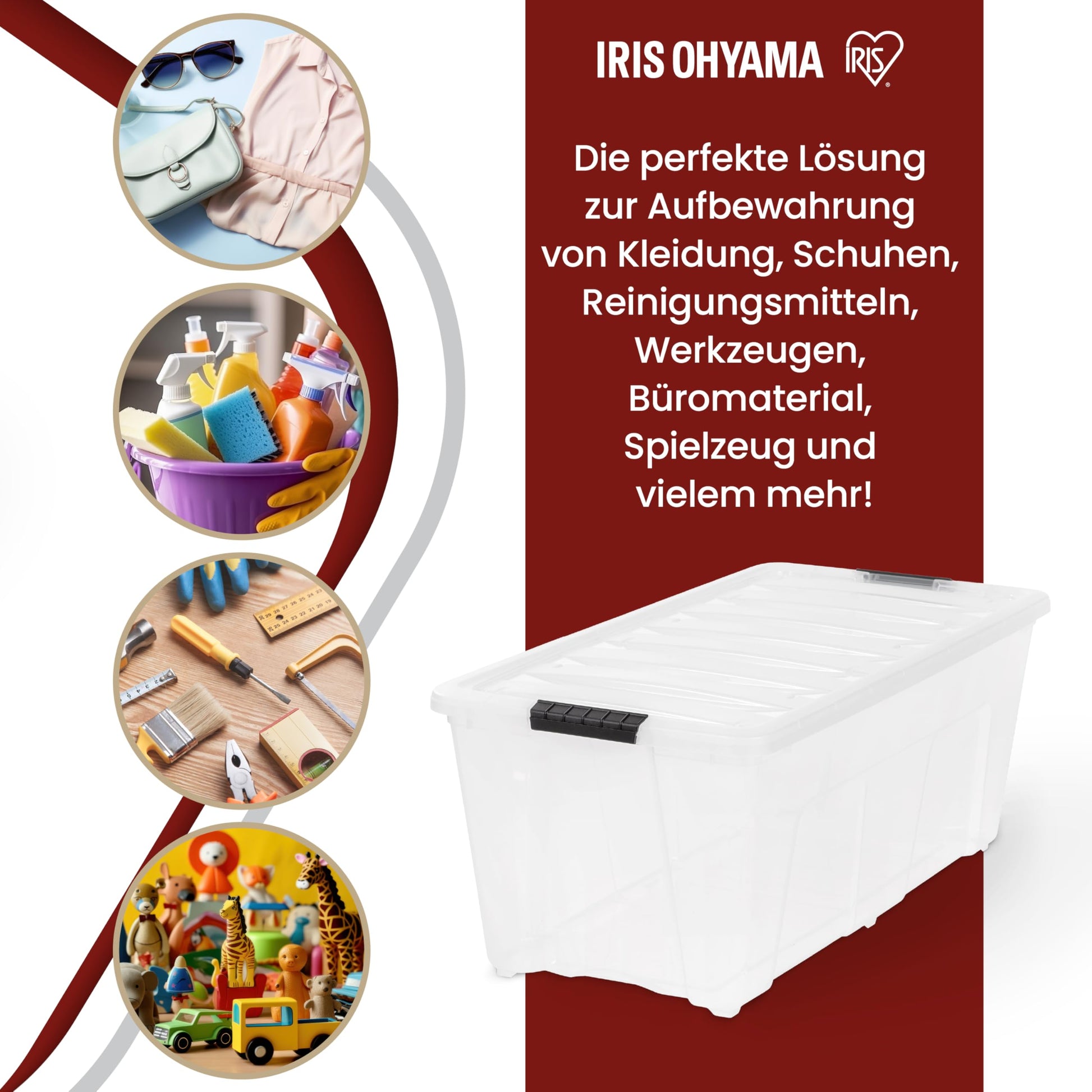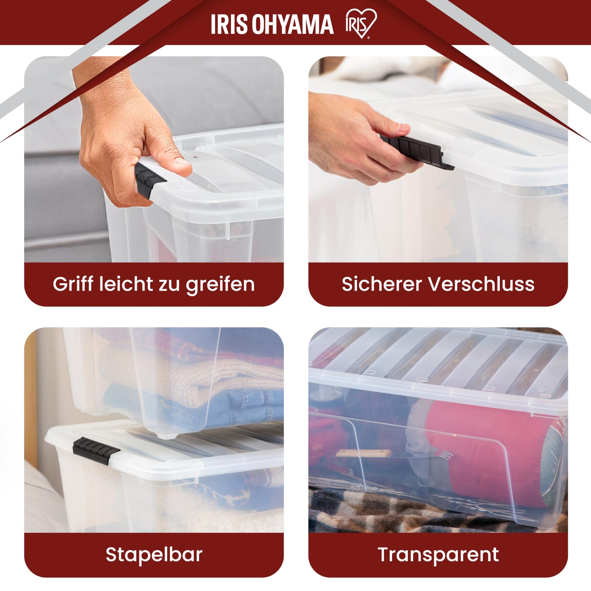 - Stapelbares Design: Die stabilen Deckel ermöglichen ein sicheres Stapeln mehrerer Boxen, um den Lagerraum optimal zu nutzen.