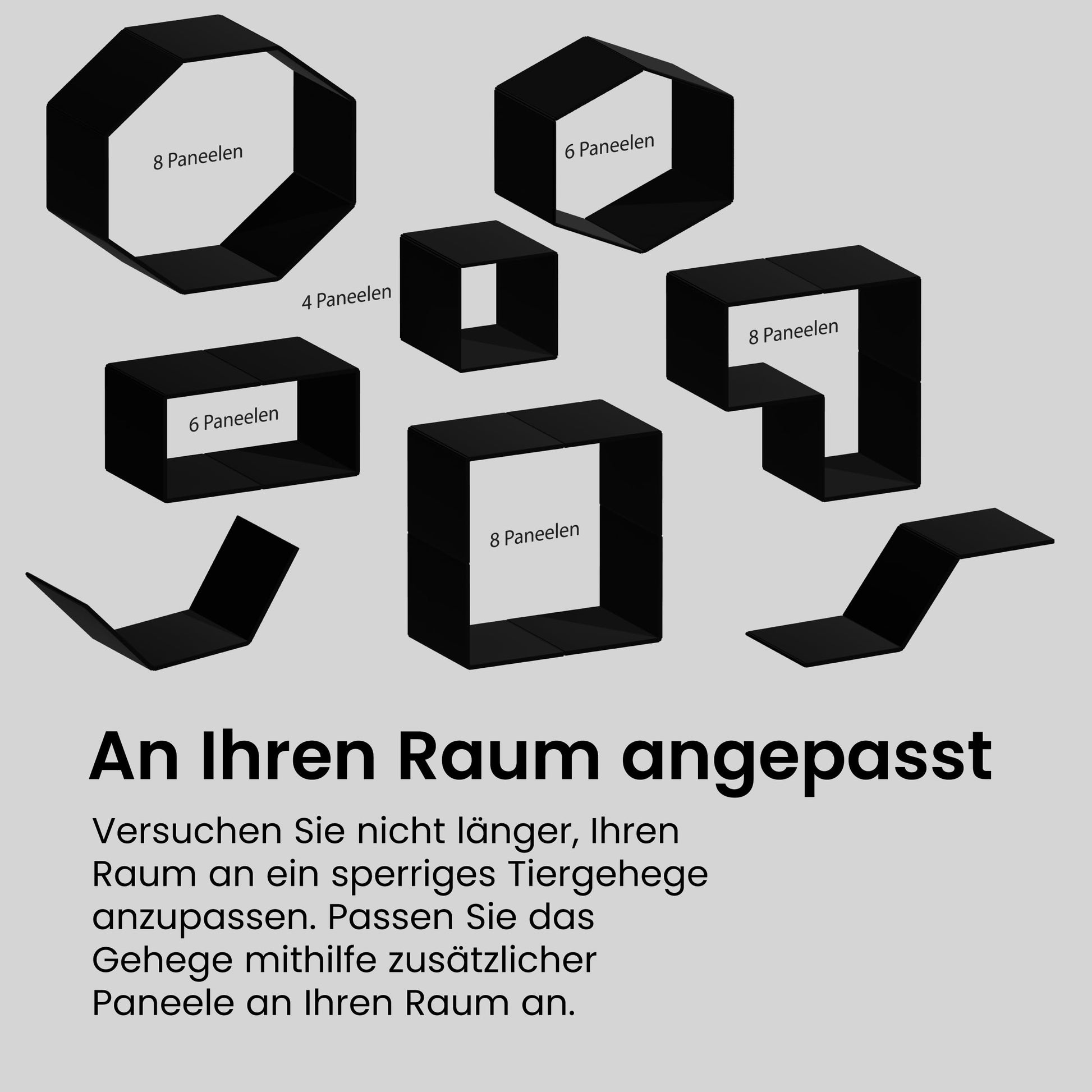 Das komplette Set besteht aus vier robusten Panelen, von denen eines eine praktische, abschliessbare Tür (40 cm x 47,5 cm) für einfachen Zugang beinhaltet. Zusätzlich werden acht rutschfeste Gummifüsse für einen sicheren Stand mitgeliefert.