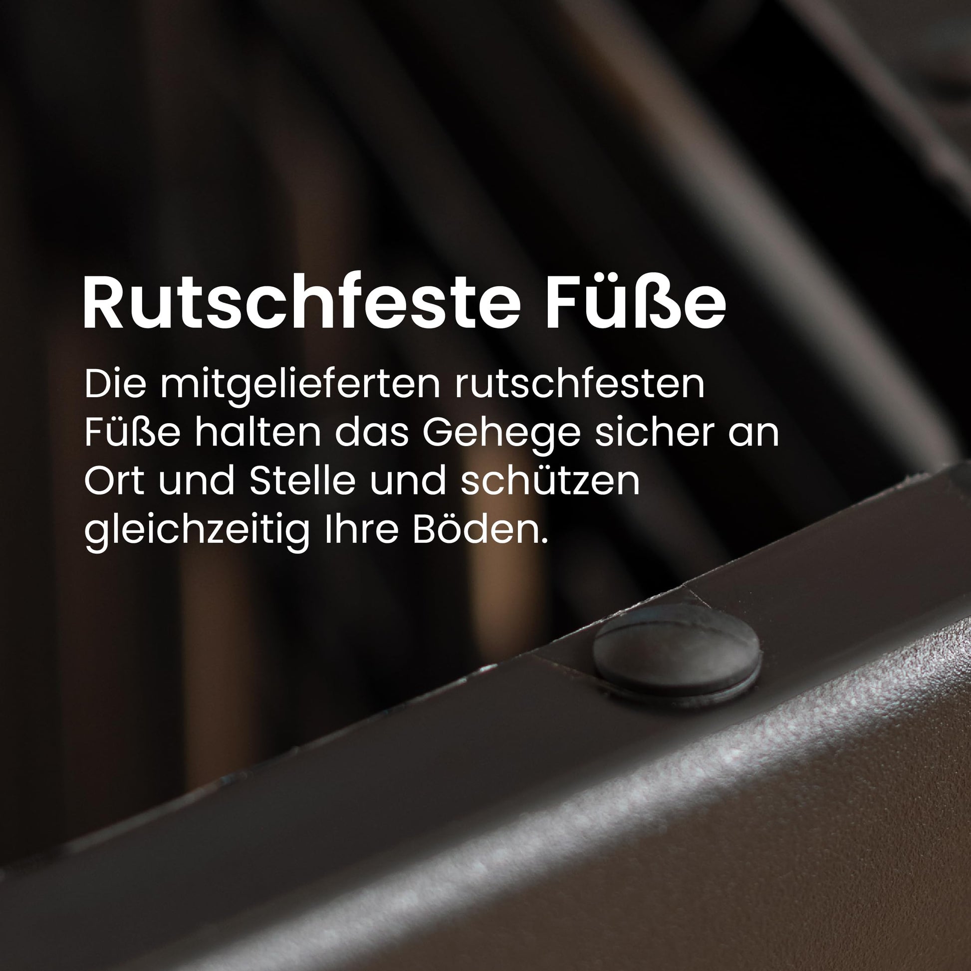 Ja, das Gehege ist aus robustem, pflegeleichtem Polypropylen gefertigt und eignet sich sowohl für den Innen- als auch für den Aussenbereich. Die acht mitgelieferten rutschfesten Gummifüsse sorgen dabei für einen stabilen Stand auf festen Oberflächen.