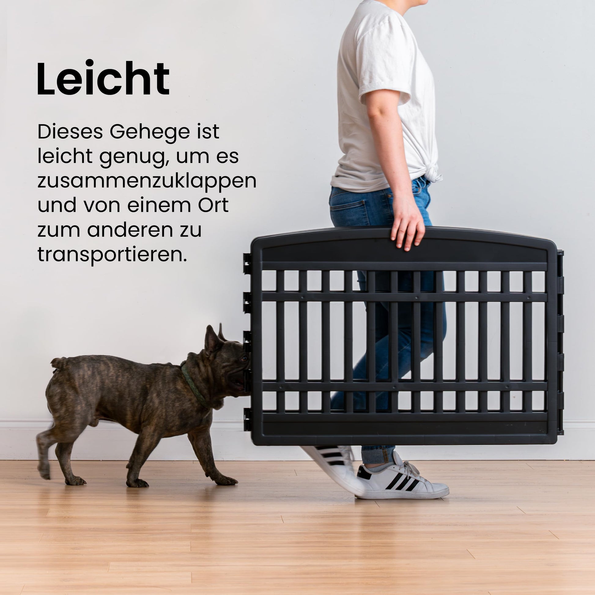 Der Auslauf ist perfekt für Welpen, kleine bis mittelgrosse Hunde sowie andere Kleintiere mit einem Gewicht von bis zu 12 kg. Wichtig ist, dass der Kopf des Tieres nicht durch die Gitterstäbe passt. Für die meisten ausgewachsenen Katzen ist er aufgrund der Höhe von 60 cm nicht ausbruchsicher.