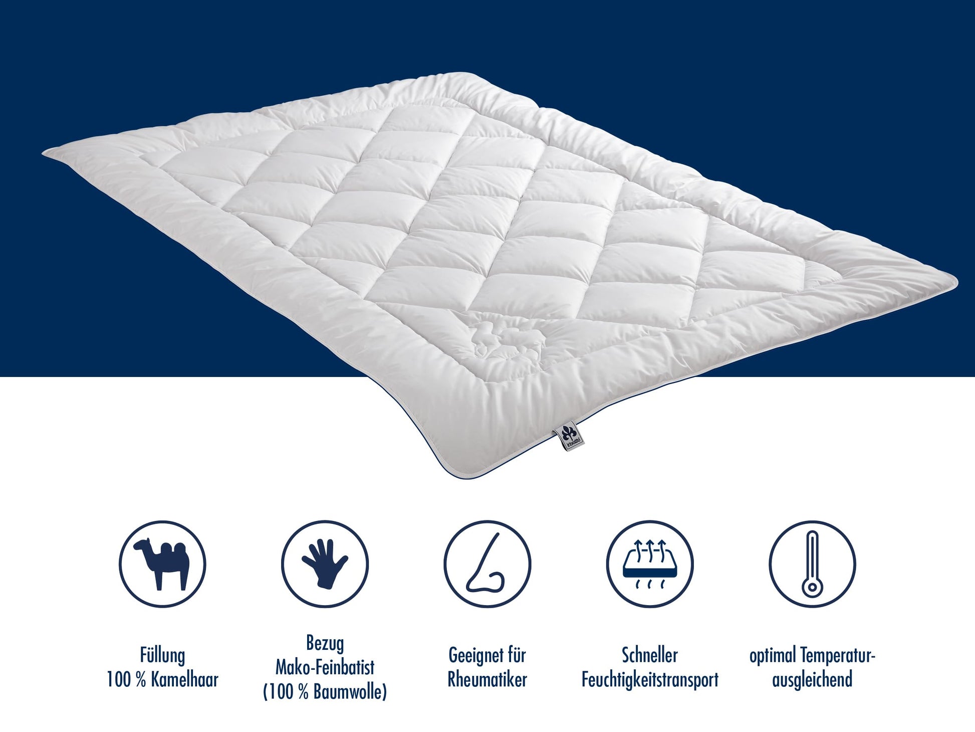 Sie ist ideal für die kalte Jahreszeit und perfekt für Personen, die zu nächtlichem Schwitzen neigen, da Kamelhaar Feuchtigkeit exzellent ableitet. Dank des trockenen und warmen Schlafklimas wird sie auch besonders für Rheumatiker empfohlen.