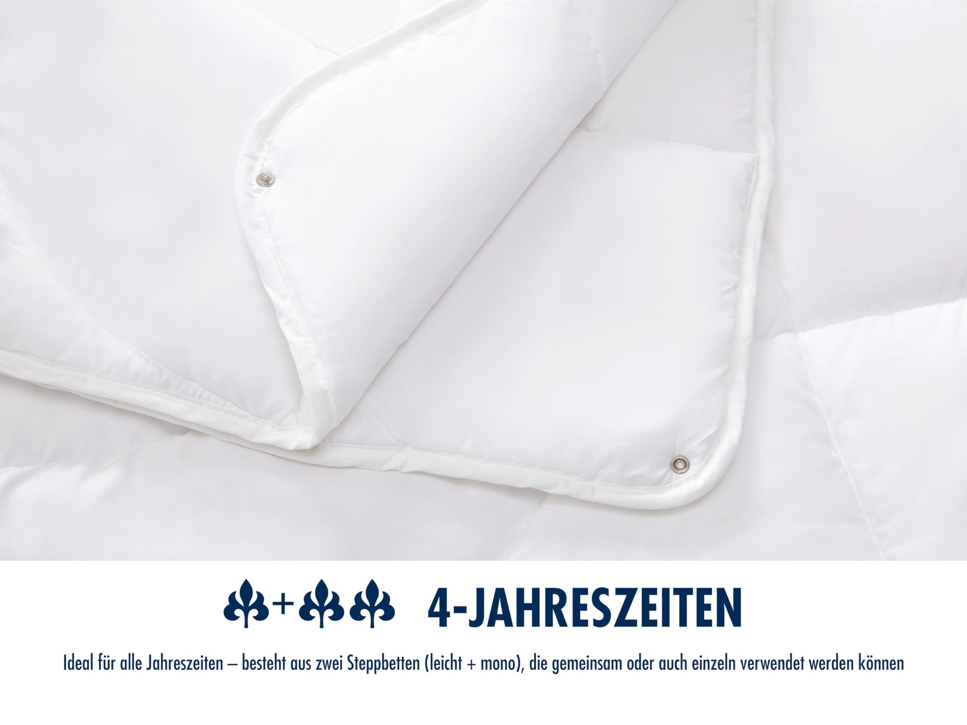 Die Decke besteht aus zwei Teilen: einer leichten Sommerdecke (ca. 500 g Füllung) für warme Nächte und einer wärmeren Übergangsdecke (ca. 900 g Füllung) für Frühling und Herbst. Für den Winter können Sie beide Decken einfach mittels Druckknöpfen zu einer kuschelig warmen Winterdecke verbinden.