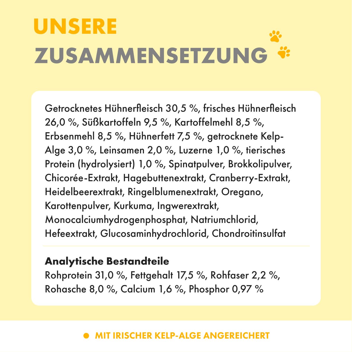 - Hoher Fleischanteil: Besteht zu 65 % aus hochwertigem Fleisch von irischen Freiland-Hühnern.