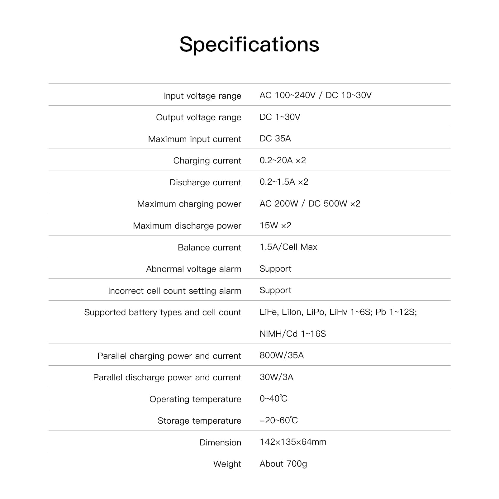 - Unterstützte Akkutypen: LiFe, Lilon, LiPo 1~6S, LiHv 1-6S, Pb 1-12S, NiMH/Cd 1-16S