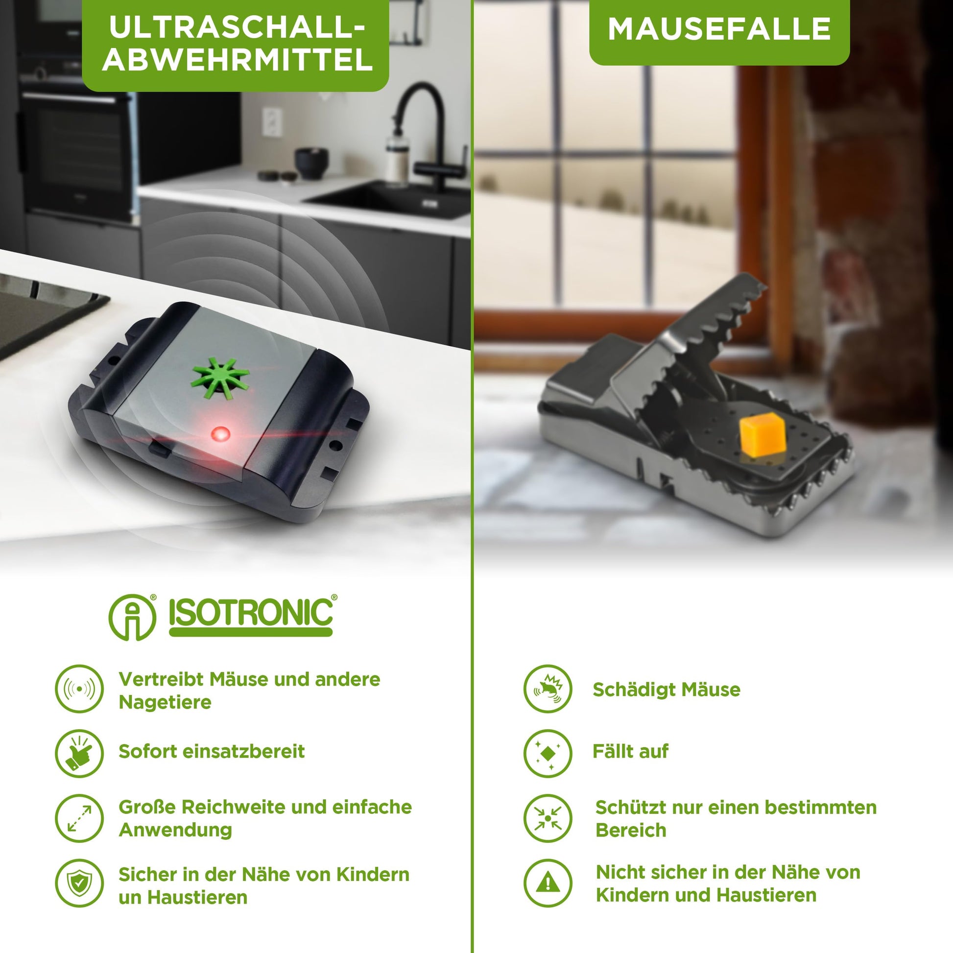 Verzichten Sie vollständig auf Gift, Köder oder gefährliche Fallen. Diese Methode ist umweltfreundlich und sicher für Ihr Umfeld mit Kindern oder Haustieren. Sie schützt Ihr Eigentum, ohne den Nagetieren zu schaden, und stellt eine hervorragende Alternative oder Ergänzung zu herkömmlichen Mäusefallen dar.
