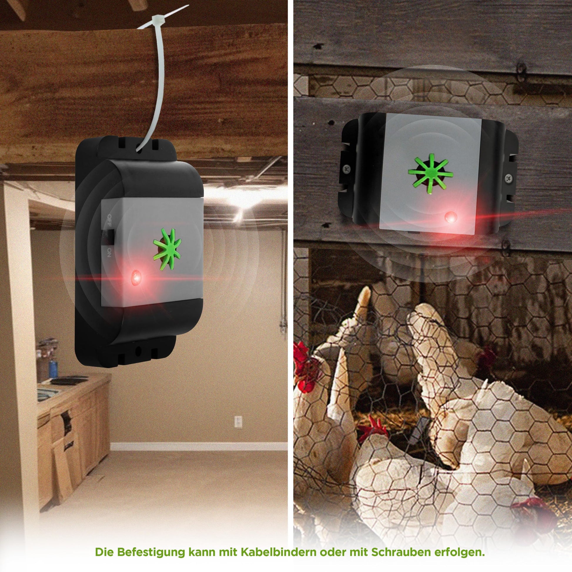 Dank des regenwasserdichten Gehäuses eignet es sich ideal für Innenräume wie Keller oder Dachboden und für Aussenbereiche wie Garten, Terrasse oder Scheune. Ein Gerät deckt ca. 40 m² ab. Da Ultraschall keine Wände durchdringt, wird für einen lückenlosen Schutz ein Gerät pro Raum empfohlen.