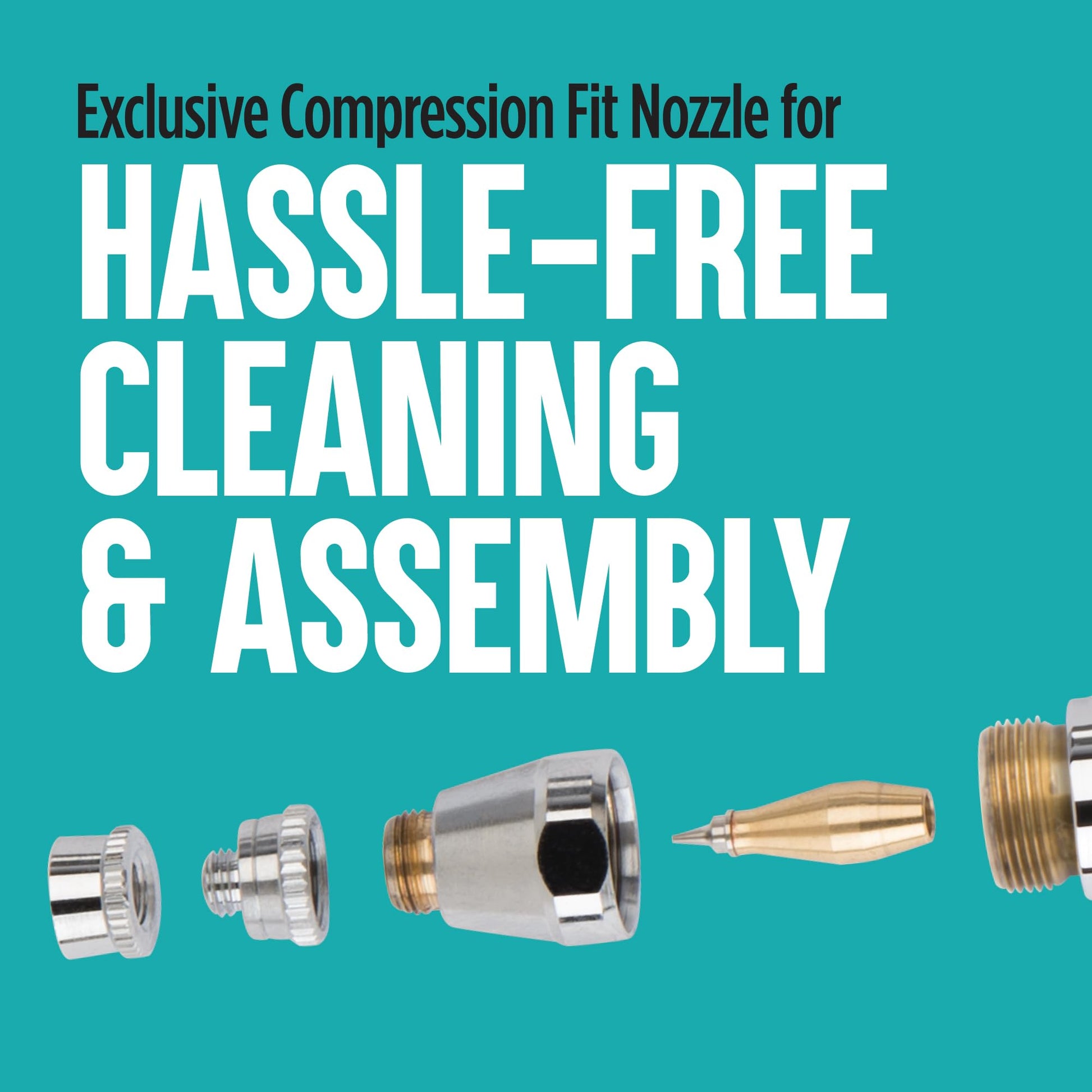 Mit ihrer präzisen 0,35-mm-Nadel- und Düsenkombination ermöglicht die Pistole ein sehr flexibles Sprühbild, das von haarfeinen Linien für kleinste Details bis hin zu Flächen von ca. 50 mm Breite reicht.