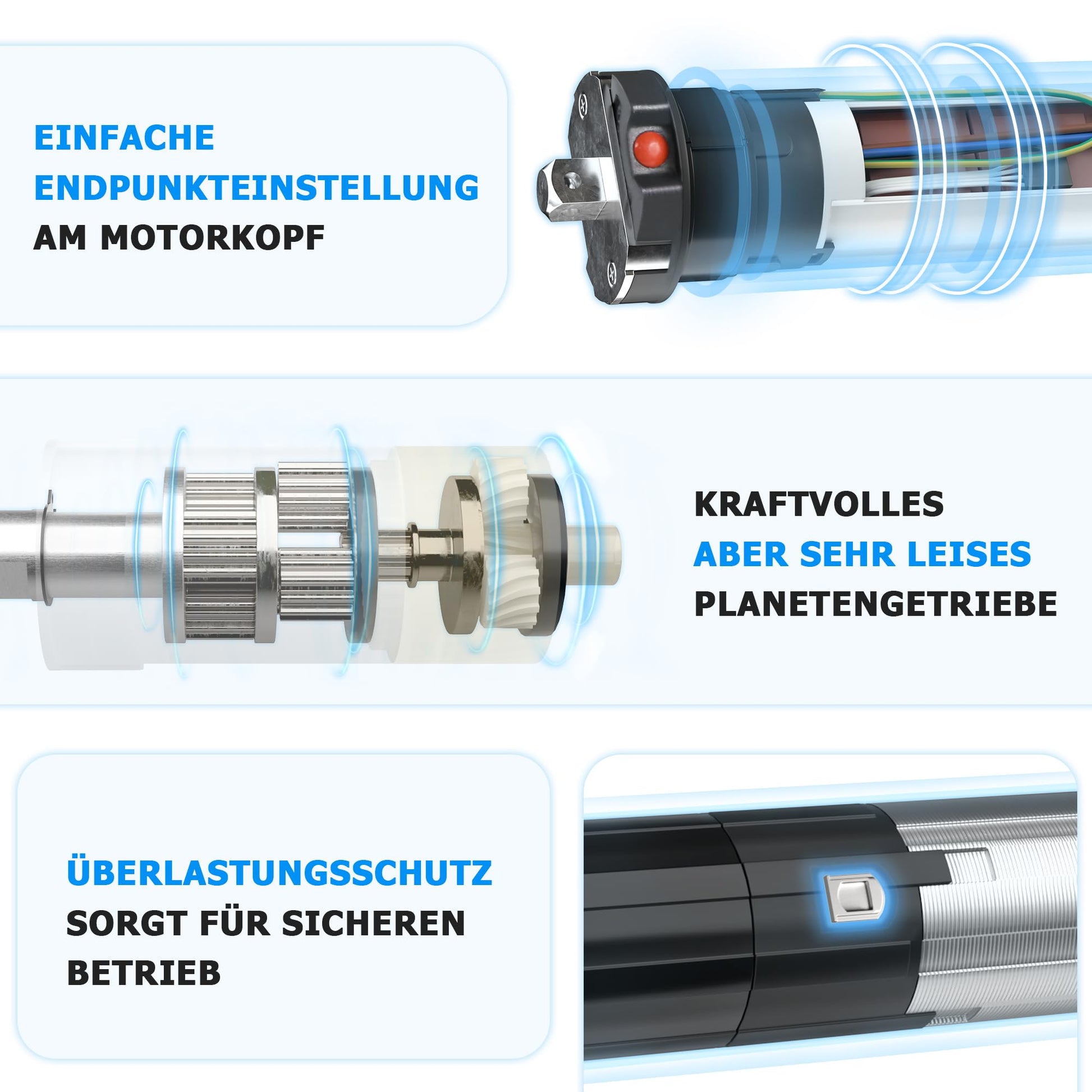 Die Endpunkte (der oberste und unterste Haltepunkt) werden elektronisch über den angeschlossenen Rollladenschalter oder ein Einstellkabel eingestellt. Dank der integrierten Blockiererkennung stoppt der Motor auch bei einem Hindernis oder wenn der Rollladen festfriert, was die Mechanik schont.