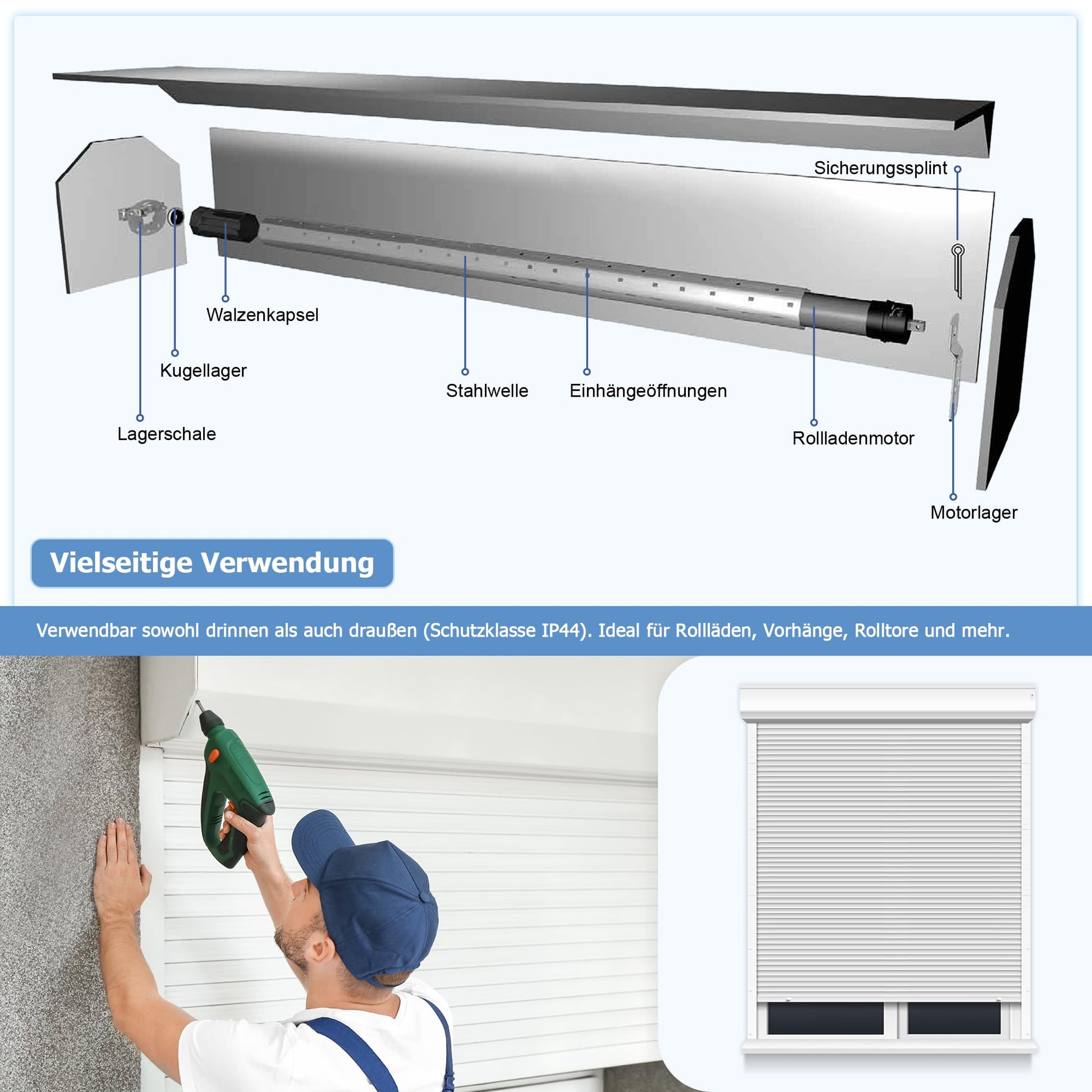 - Flexible Einsatzmöglichkeiten: Dank der Schutzklasse IP44 ist der Motor für den Innen- und Aussenbereich geeignet und kann für Rollläden, Rolltore und ähnliche Systeme verwendet werden.