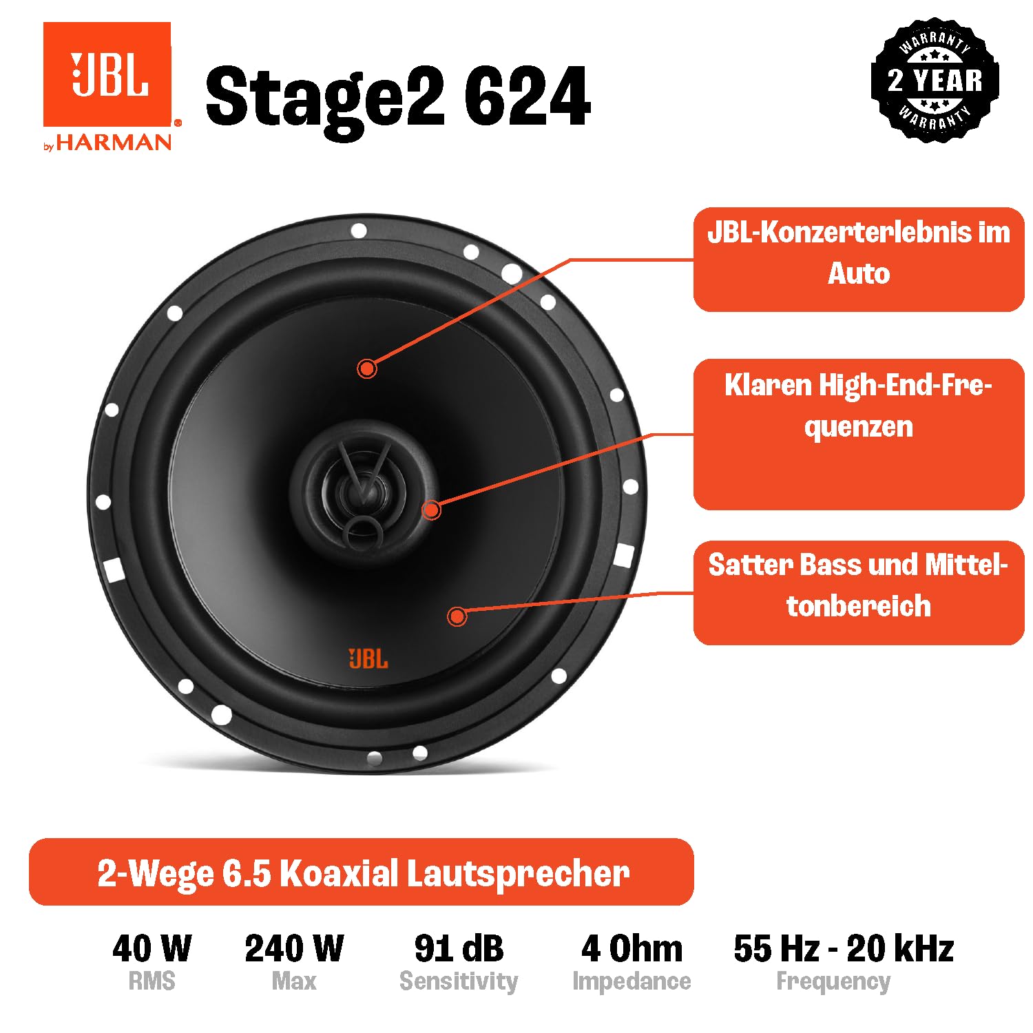 Erleben Sie Ihre Musik völlig neu – mit dem charakteristischen JBL-Sound. Dieses Lautsprechersystem wurde entwickelt, um die dynamische Audio-Performance, für die JBL bekannt ist, auch unterwegs verfügbar zu machen. Geniessen Sie einen sauberen, druckvollen Klang, der weit über die Leistung von Werkseinbauten hinausgeht.